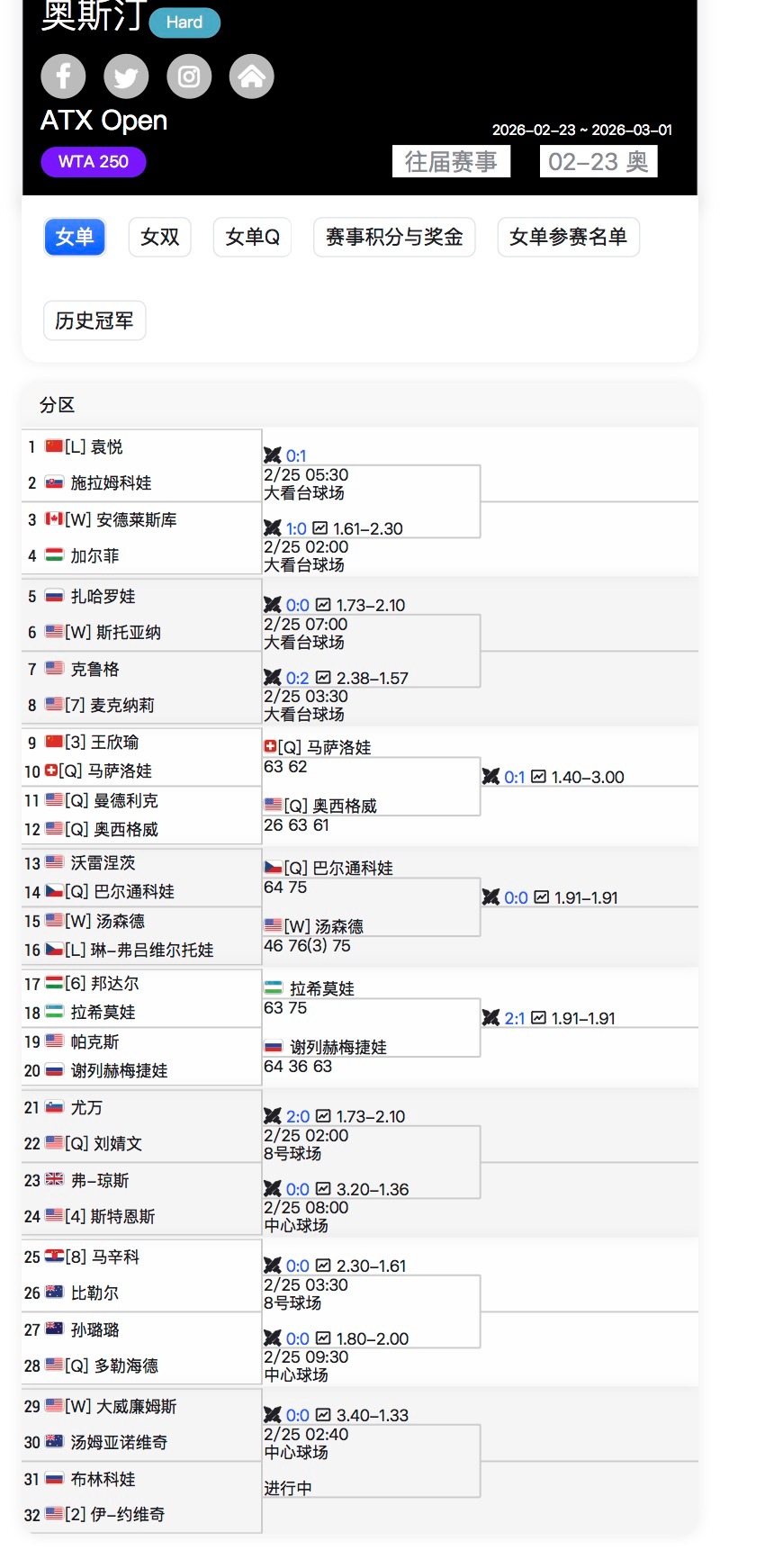 奥斯汀250赛,头号种子、刚拿到迪拜1000赛冠军的佩古拉退赛,前赛会冠军袁悦替补入围,顶替头号种子签位,首轮对阵施拉姆科娃,次轮对位安德莱斯