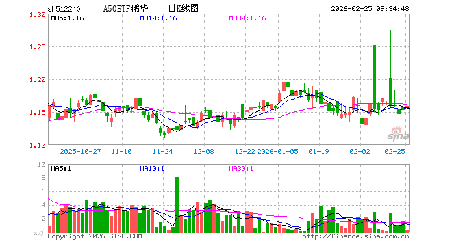 2月25日,A50ETF鹏华(512240)开盘涨0.35%,报1.157元。A50ETF鹏华(512240)重仓股方面,宁德时代开盘涨0.48%,贵州茅台涨0.22%,中国平安涨0.31%,中际旭创跌0.72%,紫金矿业涨0.20%,招商银行跌0.10%,美的集团涨0.96%,长江电力涨0.12%,立讯精密跌0.16%,中信证券涨0.04%。