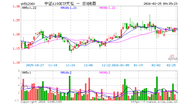 2月25日,中证A100ETF天弘(512060)开盘跌0.08%,报1.220元。中证A100ETF天弘(512060)重仓股方面,宁德时代开盘涨0.48%,贵州茅台涨0.22%,中国平安涨0.31%,中际旭创跌0.72%,紫金矿业涨0.20%,招商银行跌0.10%,美的集团涨0.96%,长江电力涨0.12%,东方财富涨0.27%,立讯精密跌0.16%。
