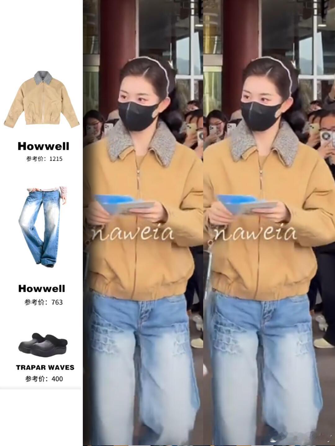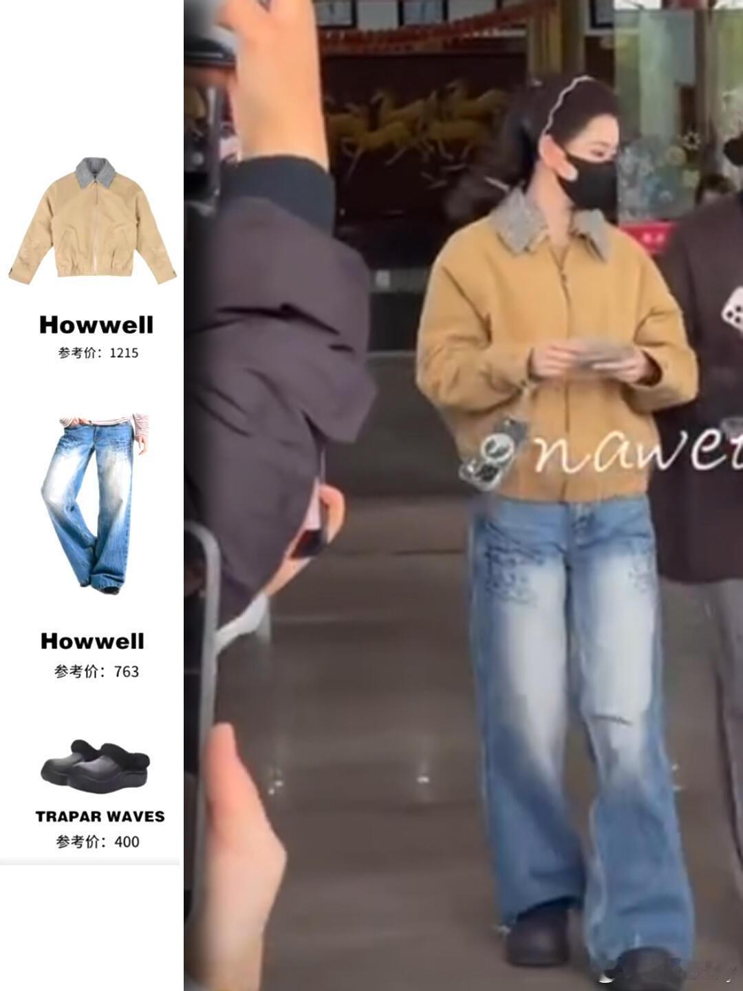 郭宇欣玉簟秋路透,卡其色工装夹克!Howwell卡其色工装夹克以毛呢翻领注入复古质感,宽松廓形随性慵懒。同品牌渐变水洗牛仔裤的做旧纹理强化街头基因,TRAPAR WAVES厚底穆勒鞋平衡整体比例,整套穿搭复古又不失个性,适配日常出街与机场出行。好美的宇欣!