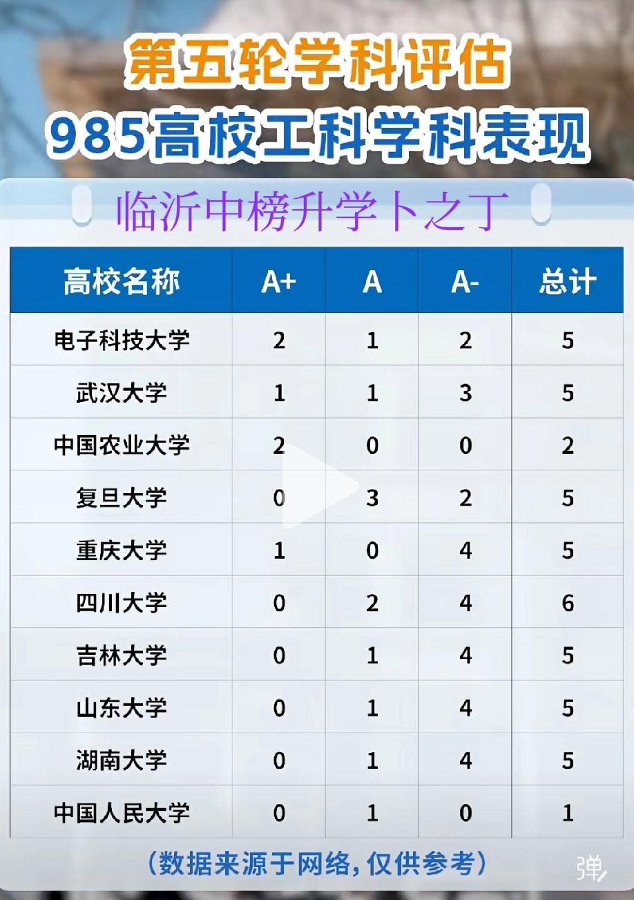 单纯从工科第五轮学科评估来看,电子科技大学、武汉大学、复旦大学、重庆大学、吉林大