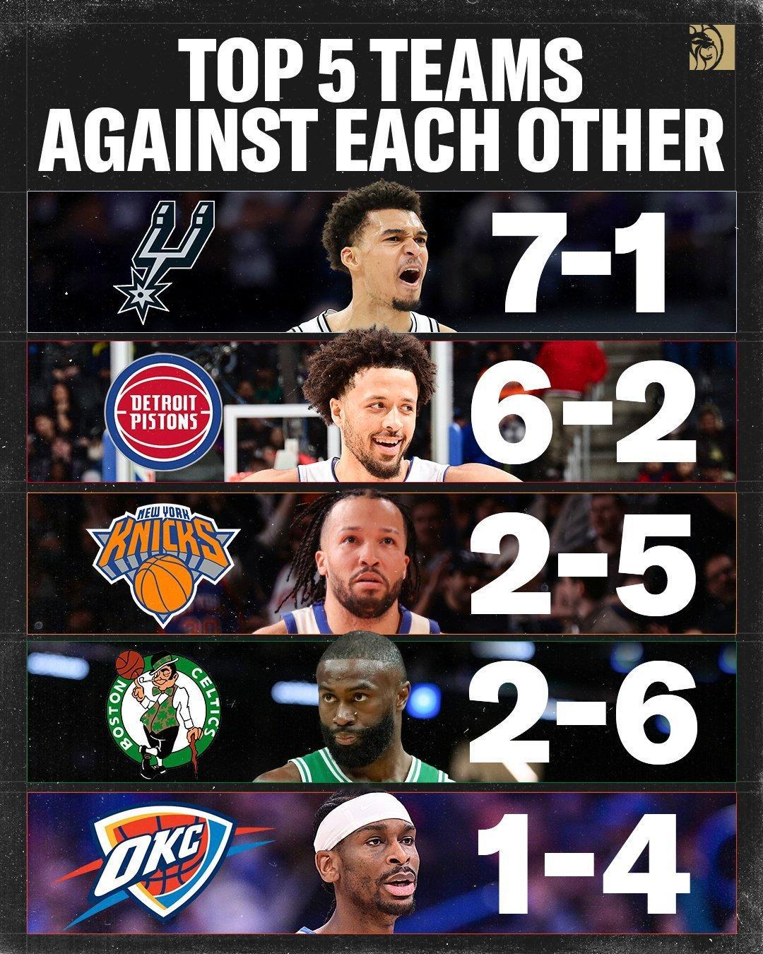 联盟前五之间的交手战绩,马刺7胜1负go刺go