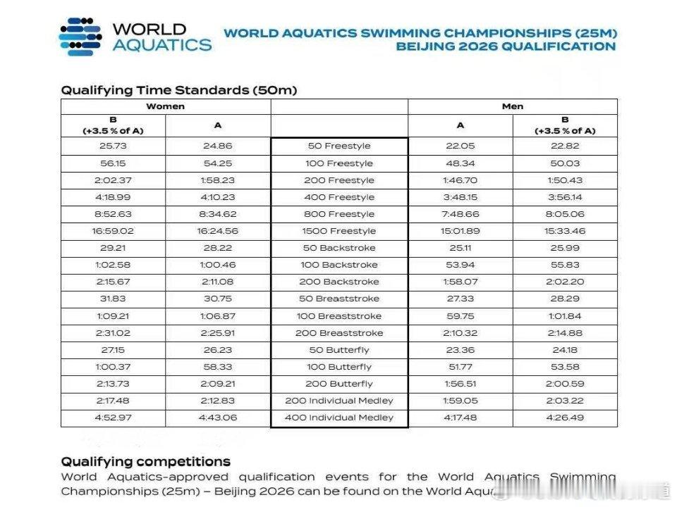 2026年北京短池世锦赛参赛标准公布(A/B标)长池/短池成绩均可达标。世界泳联