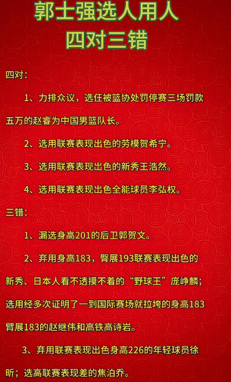 郭士强选人四对三错: 四对: 1、力排众议,选任被篮协重处罚停赛三场罚款五万的赵睿为中国男篮队长。 2、选用联赛表现出色的劳模贺希宁。 3、选用联赛表现出色的新秀王浩然。 4、选用联赛表现出色的全能球员李弘权。 三错: 1、漏选身高201厘米的后卫郭昊文。 2、弃用身高183、臂展193、联赛表现出色的新秀、日本人看不透摸不着的“野球王”庞峥麟。 3、弃用联赛表现出色身高226的年轻球员徐昕,选用联赛表现差的焦泊乔。 26日一战,中国男篮恐将一败涂地。