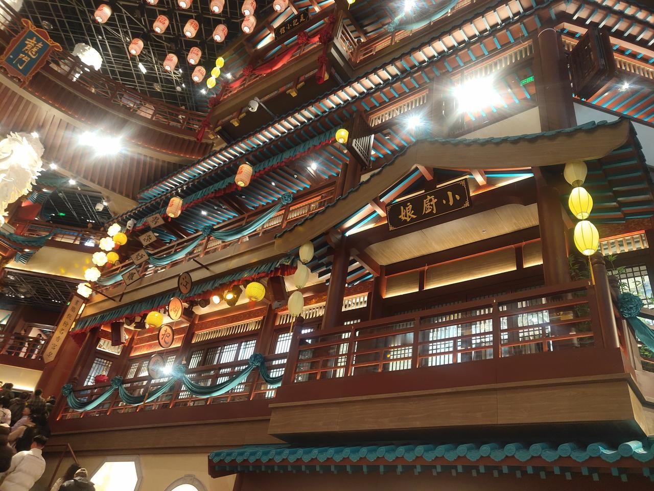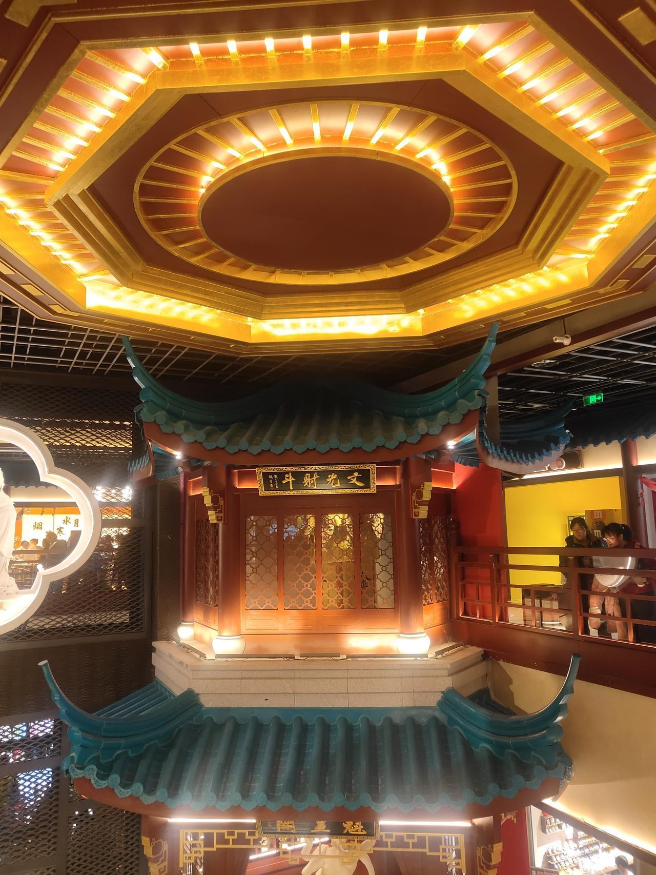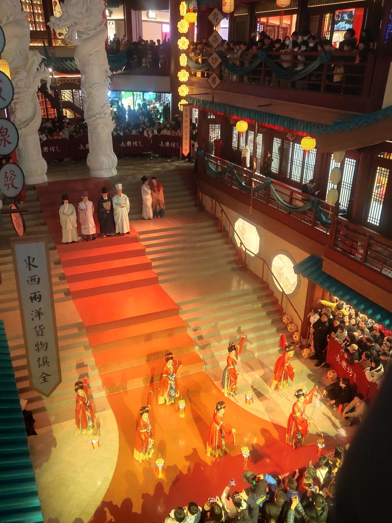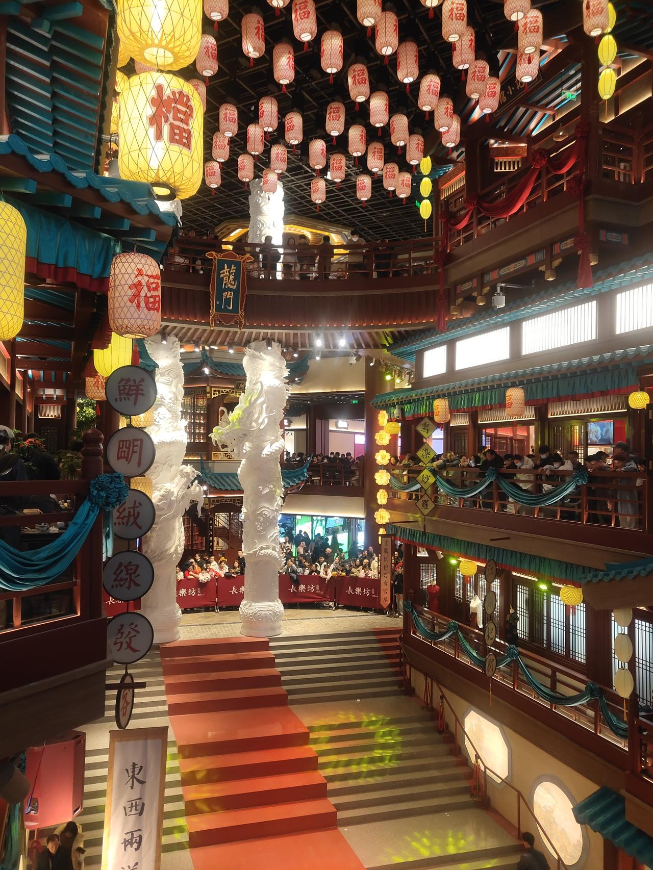 长乐坊我也踩过点了,漂亮的很,大俗即大雅,雅俗共赏,审美没话说,长在大家的心坎上。 进门两根白玉龙柱,上楼还有一条大金龙,还有一家金灿灿的店,金碧辉煌,富丽堂皇。此情此景,让人心生太平盛世的感动。 吃的喝的很齐全,楼下对外的门面有扬州富春茶社,和丁家桥网红店西北桥头拉面大王,就是那个常年排队的大锅贴,不再是全城独此一家,长乐坊也有了。 进门南京大排档和小厨娘淮扬菜一左一右夹道欢迎,然后就如同走进小街小巷的集市,一时间那些尘封在老南京人记忆中的南京牛奶厂,南京糖果厂马头牌冰棒等等,突然又冒了出来,集市烟火气浓,价格亲民,我点了两杯黑糖珍珠奶茶,一共十五块。 楼上还有沉浸式观看演艺外加用餐雅座,有档次价格也高。 现在长乐坊每天还安排三场舞蹈演出,我看的是晚上七点的那一场,时间虽然短但大家看的饶有兴致。 也有人说长乐坊这样搞搞不长,我觉得长乐坊不能光集中南京美食,最好把江苏美食都集中过来,比如有了扬州早茶,那泰州早茶是不是也可以搞起来,淮安菜是不是也可以搞起来,徐州菜等等搞个十三太保美食汇。 再就那个演出很好,一直要继续下去。