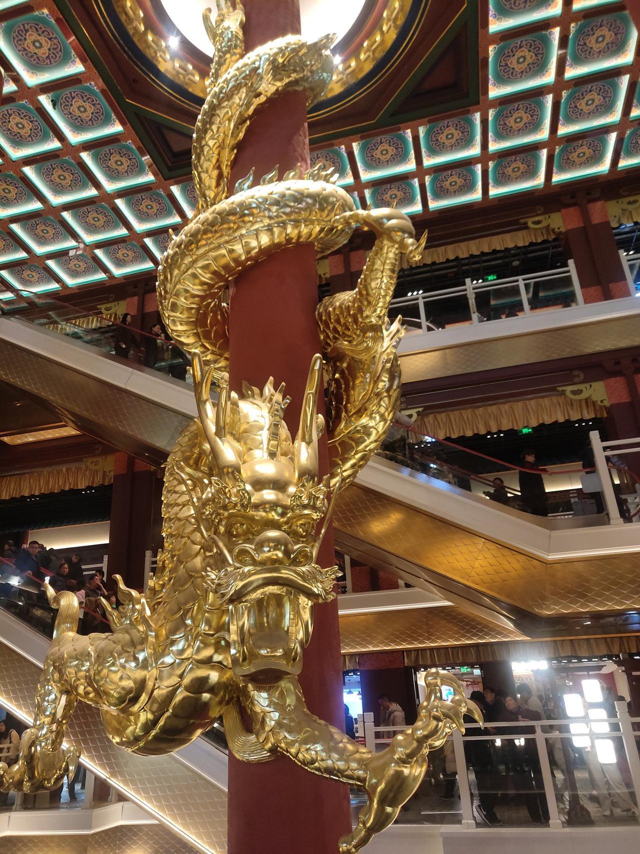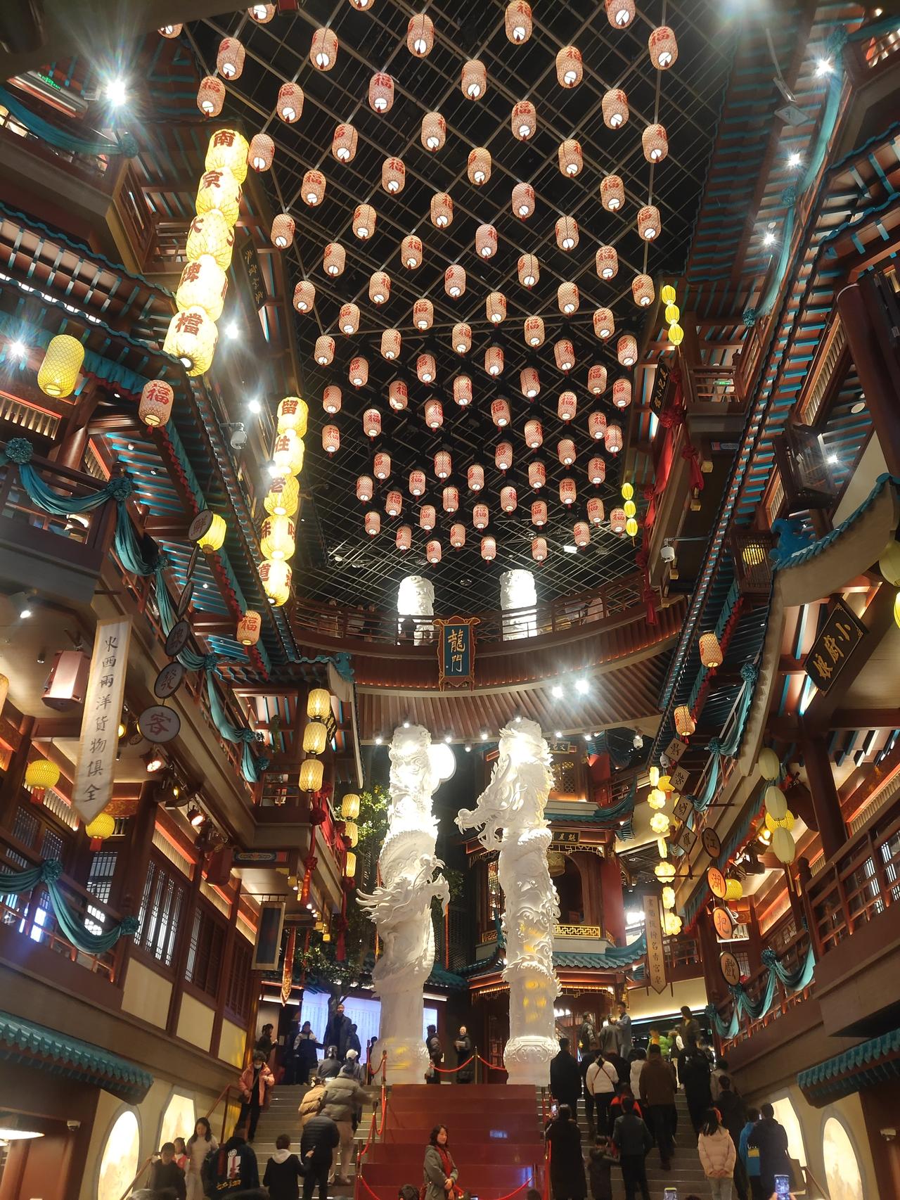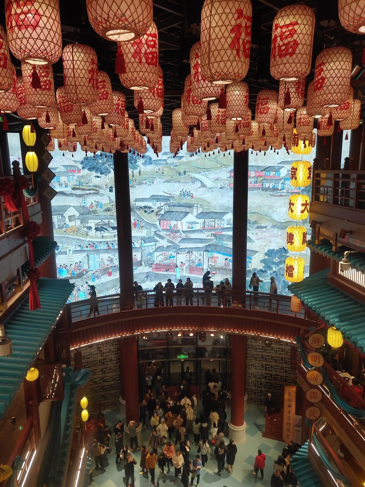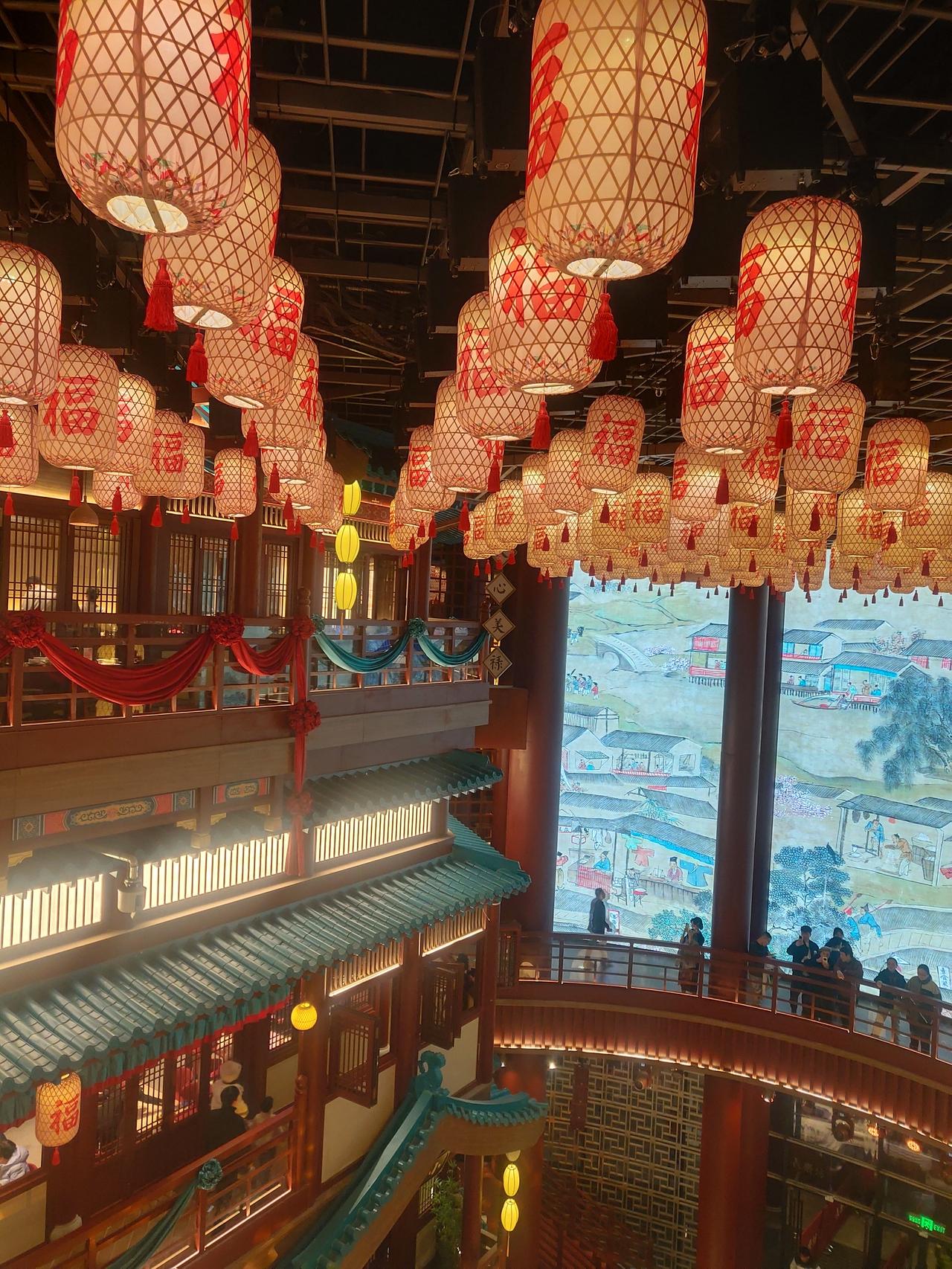 长乐坊我也踩过点了,漂亮的很,大俗即大雅,雅俗共赏,审美没话说,长在大家的心坎上。 进门两根白玉龙柱,上楼还有一条大金龙,还有一家金灿灿的店,金碧辉煌,富丽堂皇。此情此景,让人心生太平盛世的感动。 吃的喝的很齐全,楼下对外的门面有扬州富春茶社,和丁家桥网红店西北桥头拉面大王,就是那个常年排队的大锅贴,不再是全城独此一家,长乐坊也有了。 进门南京大排档和小厨娘淮扬菜一左一右夹道欢迎,然后就如同走进小街小巷的集市,一时间那些尘封在老南京人记忆中的南京牛奶厂,南京糖果厂马头牌冰棒等等,突然又冒了出来,集市烟火气浓,价格亲民,我点了两杯黑糖珍珠奶茶,一共十五块。 楼上还有沉浸式观看演艺外加用餐雅座,有档次价格也高。 现在长乐坊每天还安排三场舞蹈演出,我看的是晚上七点的那一场,时间虽然短但大家看的饶有兴致。 也有人说长乐坊这样搞搞不长,我觉得长乐坊不能光集中南京美食,最好把江苏美食都集中过来,比如有了扬州早茶,那泰州早茶是不是也可以搞起来,淮安菜是不是也可以搞起来,徐州菜等等搞个十三太保美食汇。 再就那个演出很好,一直要继续下去。