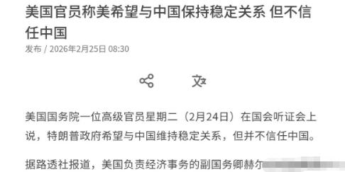 美国再次对咱们喊话!美国心里面这是有多憋屈,美国政府希望与中国维持稳定关系,但并不信任中国,说白了,做生意交朋友讲究一个诚信,若是美国总想着“留一手”,那中美关系很可能只会是表面上的稳定。 首先咱们要清楚一件事情,那便是特朗普即将访华,而他访华的目的几乎也很明确,就是想和中国达成更多的合作。 要知道,随着中日矛盾爆发后,美方也试探过中方的态度,美方宣布对台军售,结果很快就遭到了中方的“制裁”,从这不难看出,在原则问题上,中方没有商量的余地。 如今美国的对华态度明显柔和了许多,或许他们也不想在访华前节外生枝,而不管怎么说,特朗普这趟来中国,对咱们来说还是有一定好处的,尤其是中日关系的处理上。 目前高市早苗的态度也有了些许反转,但若是她不撤回错误言论,估计中日关系还会僵持下去。