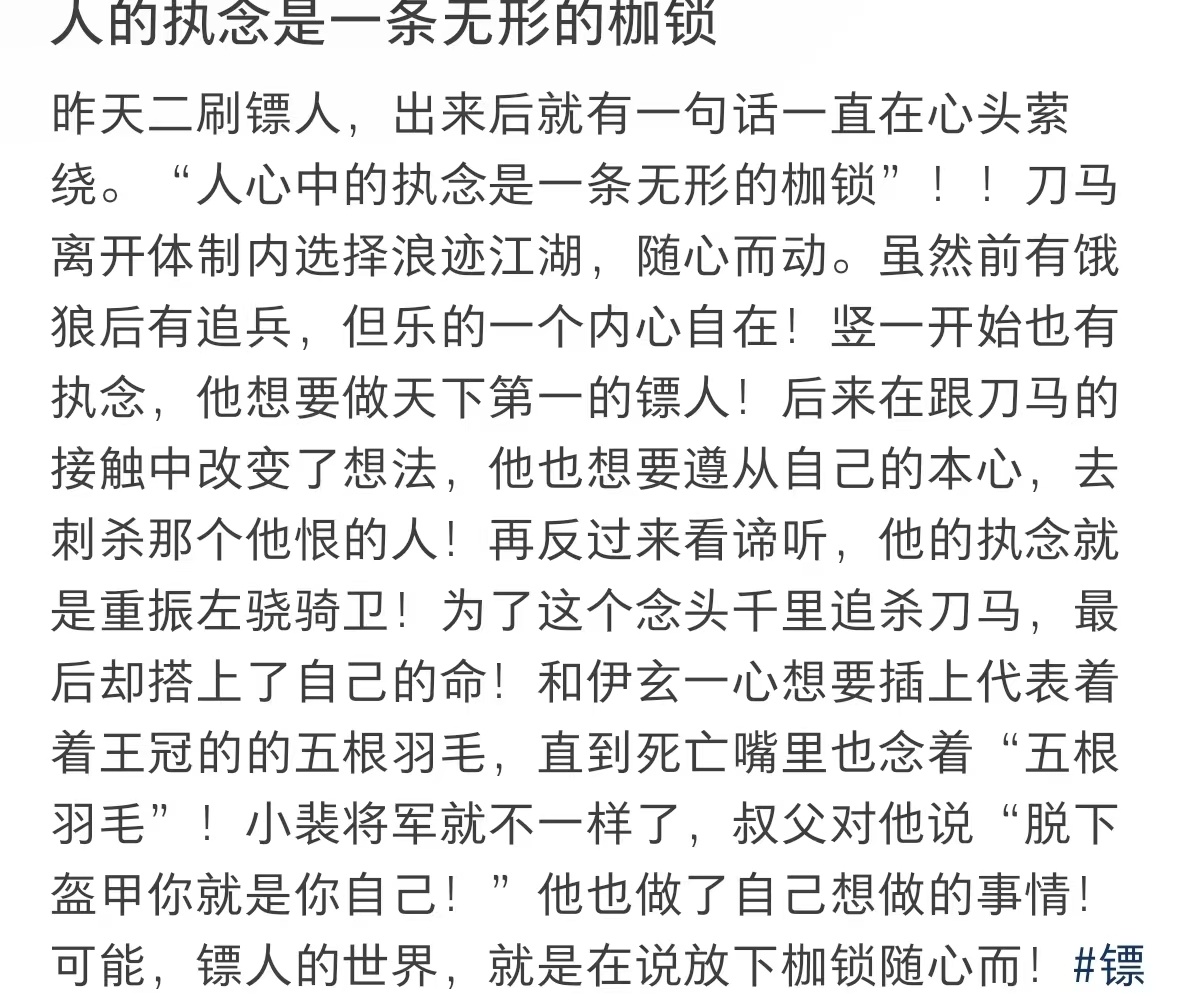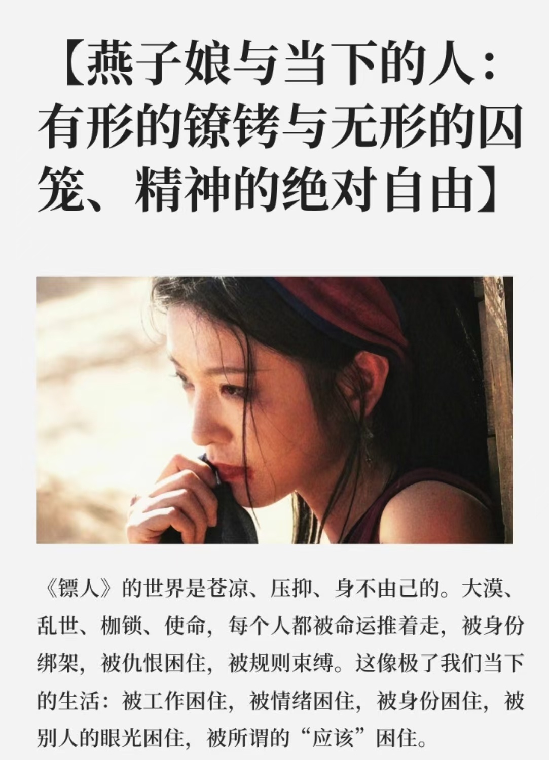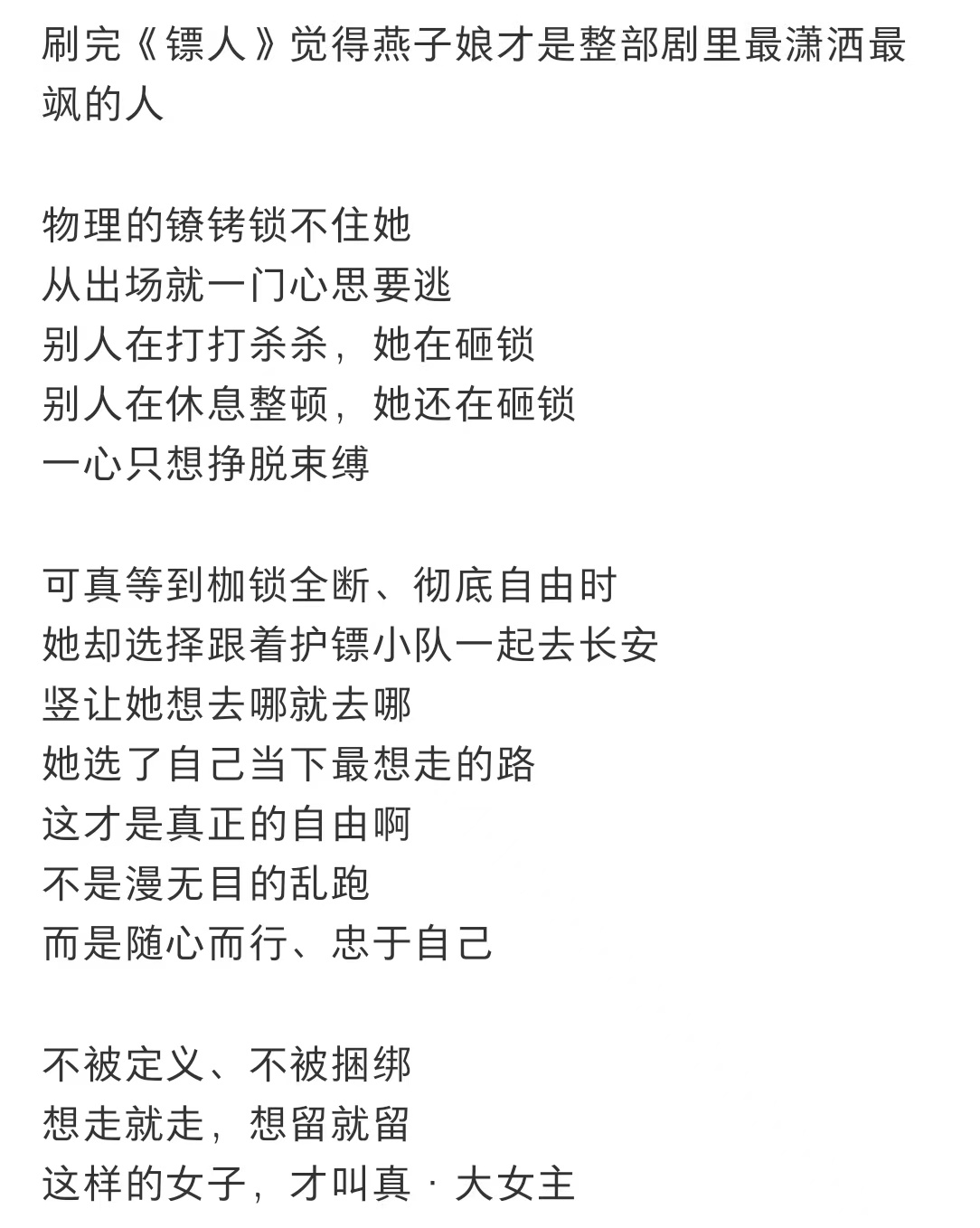 镖人的思想还是太超前了 如果说刀马是被过去捆绑的浪子,那燕子娘就是被现实囚禁的诗人。竖在优绩主义里迷失,谛听与伊玄在精英赛道里殊途。《镖人》最戳心的,不是江湖的刀光剑影,而是把现代人的精神困境,藏进了隋唐的风沙里。