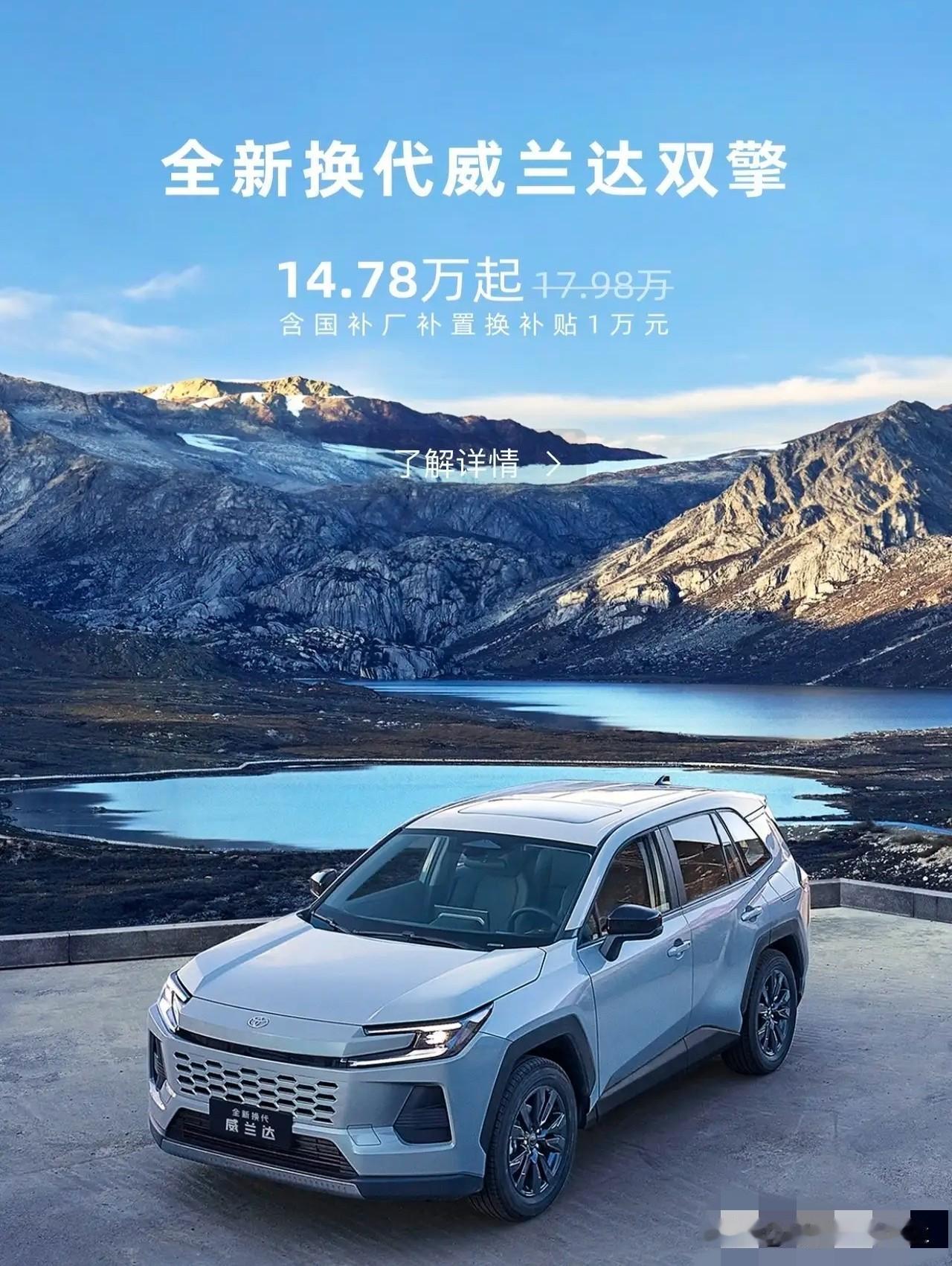 一觉醒来,车市炸锅了!小米没想到,比亚迪没想到,特斯拉更没想到,丰田又杀回来了! 13.78万起!丰田威兰达AIR版,入门版直接“满配”,车市已经彻底炸锅了。 随着消费者的越来越理性,像买车这样的大宗支出,更要精打细算,重点选择动力和续航,智能。 广汽丰田精准把握家用需求,推出全新威兰达AIR版,以13.78万起的诚意权益价,打造“花得值、用得爽”的优质选择,重新树立15万级家用SUV的标杆。 威兰达AIR版,延续了丰田全球车型的经典设计,大气稳重又自带年轻动感。 流畅舒展的车身线条,加上精致耐看的前脸造型,搭配18英寸轮毂,显得气场十足。 不管是日常上班,还是节假日自驾,回头率百分之百,经典造型久不过时,完美契合不同家庭的审美。 动力上,新车提供2.0L燃油版,以及2.0L双擎混动版两套方案,充分综合了好开与省油。 燃油版动力输出平稳,无论是在城市通勤,还是高速超车都能从容淡定,因为综合油耗低到每100公里仅6.29L。 “一分钱,一分货”!混动版在油耗表现上更进一步,每100公里仅4.59L。 更亮眼的是,两驱版标配LSD限滑差速器,面对雨雪湿滑或者泥泞坑洼路段,也能拥有接近四驱的稳定与脱困能力。 智能与舒适配置方面,全系搭载丰田TSS 4.0智能驾驶辅助系统,实现L2级辅助驾驶全覆盖。 无论是高速巡航,还是拥堵跟车及并车,安心又省心。 车内配备高级皮质座椅,真皮方向盘,64色氛围灯,搭配50W无线快充,智能座舱操作流畅,彻底告别低配车的简陋感。 空间方面,标准5座布局搭配宽裕轴距,后排乘坐宽敞舒展,中间地台低矮,坐上3人也不会挤。 后备箱超能装,宝宝的婴儿车、行李箱、露营装备统统塞下,全方位满足不同家庭出行的使用。 除此之外,威兰达AIR版还带来超安心的用车保障:动力系统终身质保,发动机、变速箱、动力电池全程兜底。 8年超长低息金融方案,首付低、月供压力小,年轻人也能轻松入手。 在理性消费成为主流的今天,不盲目追求溢价,只选择靠谱和实用。 威兰达AIR版以满配的实力,让每一分钱都花在刀刃上,既是15万级SUV里的高性价比之选,也是家用出行的最佳搭档。
