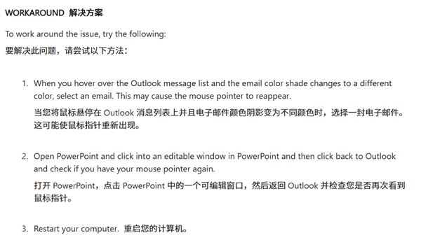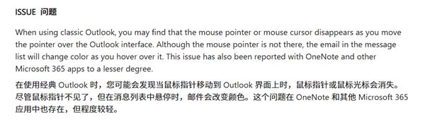 根据微软官方发布的支持文档,该Bug主要出现在经典版Outlook中,当用户将鼠标悬停在应用界面内时,光标会突然消失。