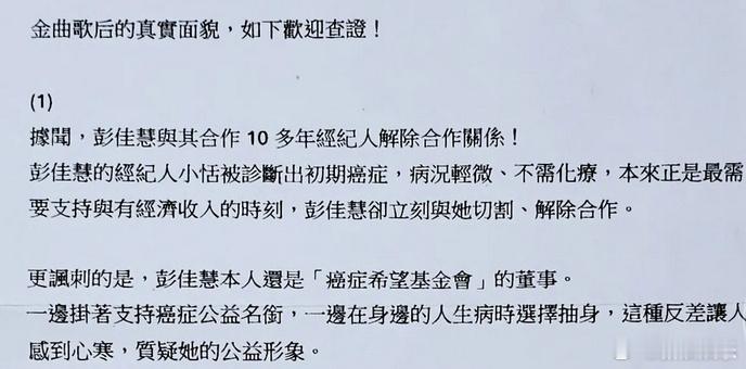 彭佳慧方否认霸凌传闻 据台媒,彭佳慧被曝在前经纪人小恬确诊癌症后立刻解除合作、分道扬镳,还传出言语霸凌等引热议。对此,彭佳慧现经纪人对传闻表示否认:“爆料信把不再合作的事情如此扭曲,其实才是让我们最难过的。”她称真心希望不要有过多的臆测,希望大家一切安好。