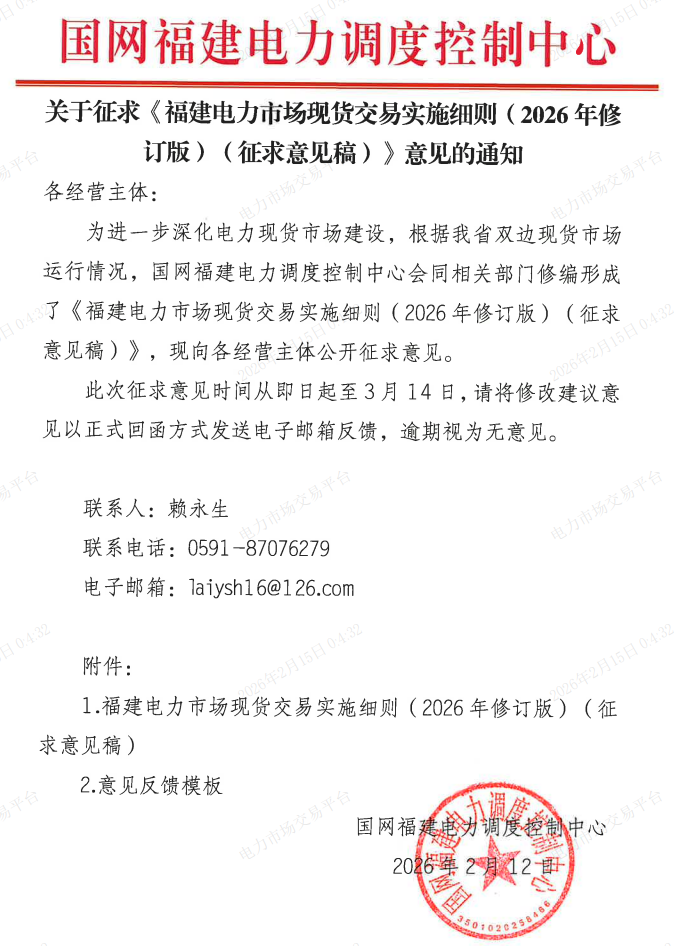 为进一步深化电力现货市场建设,根据我省双边现货市场运行情况,国网福建电力调度控制中心会同相关部门修编形成了《福建电力市场现货交易实施细则(2026年修订版)(征求意见稿)》,现向各经营主体公开征求意见。