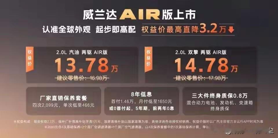 不管你信不信,2026年将发生的八大现象: 1、越来越多的农村,只剩下老人和儿童,彻底沦为留守村。 2、许多偏远地区,因彩礼过高,光棍越来越多。 3、退休金会持续上涨,钱越来越不好挣,房价越来越低。 4、年轻人结婚会越来越晚,单身贵族已越来越多。 5、大部分内容创作和编程,会被 AI 快速替代。 6、机器人养老不再遥不可及,将彻底取代人工照顾老人。 7、消费者已经越来越理性,买车更注重品质、动力、安全性能等。 8、随着国补三大政策落地,买新能源车的人越来越多。 家用理想SUV不二之选——威兰达AIR,五大优势惊艳我的每一次出行。 买车作为家庭大宗支出,我始终坚持品质和实用性兼顾的原则。 经过反复对比多款车型后,广汽丰田威兰达AIR版成功打动了我,它凭借五大硬核优势,成为我心中15万级合资家用SUV的不二之选。 初见威兰达AIR,便对它大气优雅的外观“一见倾心”。 该款车承袭了丰田的经典设计,流畅舒展的车身线条,再搭配精致大气的前脸造型,加上质感十足的18英寸轮毂,让整体气场十分沉稳不失时尚感。 无论是日常通勤代步,还是周末全家出游,开在路上体面又耐看,多年后也不会过时,完全契合对家用车颜值与格调的双重期待。 坐进车内,满满的智能与舒适配置让人倍感惊喜。 新车全系搭载丰田最新TSS 4.0智能驾驶辅助系统,实现L2级智能辅助驾驶全覆盖。 无论是高速巡航,还是城市拥堵跟车时,能大幅缓解司机的驾驶疲惫,从源头上帮你杜绝了安全隐患。 高级皮质座椅,加上真皮方向盘搭配64色氛围灯,把质感直接拉得满满的,50W无线快充,更是解决了手机电量的焦虑。 入门即高配,彻底告别合资“丐版”的简陋感,真正的颜值担当。 动力表现更是超出预期,威兰达AIR提供2.0L燃油与2.0L双擎混动两种动力选择,输出平顺线性。 就算在城市自由穿行,或在高速超车都完全稳如泰山,轻轻松松成为满街“最靓的仔”。 最令人安心的是,两驱版本标配LSD限滑差速器,面对雨雪湿滑、泥泞路段时,抓地力与稳定性大幅提升。 拥有接近四驱的脱困能力,家用代步与轻度越野都能稳操胜券,完美胜任。 续航与油耗,更是威兰达AIR的核心亮点,燃油版百公里综合油耗低至6.29L,混动版更是低至4.59L,加注92号汽油即可,日常用车成本极低。 混动版一箱油,就能轻松驰骋长途,彻底让你续航无忧。 空间表现十分完美,宽敞的5座布局搭配宽裕轴距,后排乘坐3人还绰绰有余,中间地台低矮平整,让乘客毫无局促感。 超大后备箱,不仅能轻松装下4个28寸行李箱,还能装下年货、露营装备等,解决了不同家庭的出行。 目前,威兰达AIR版售价为13.78万起,混动版也仅需14.78万起,入门即顶配的性价比,实在也太划算了! 相信在威兰达AIR的陪伴下,每一个平凡的日常出行,都会充满幸福感。