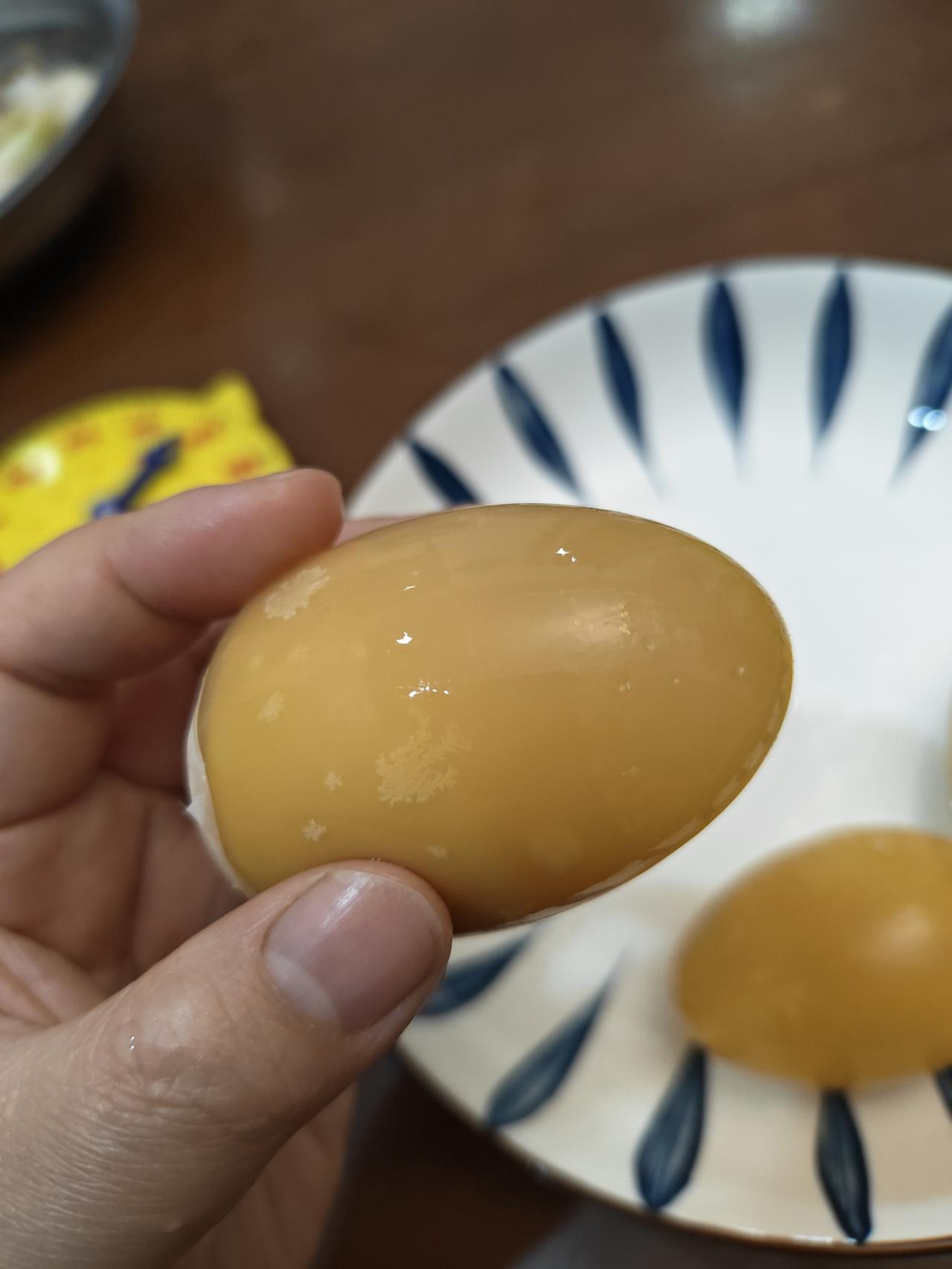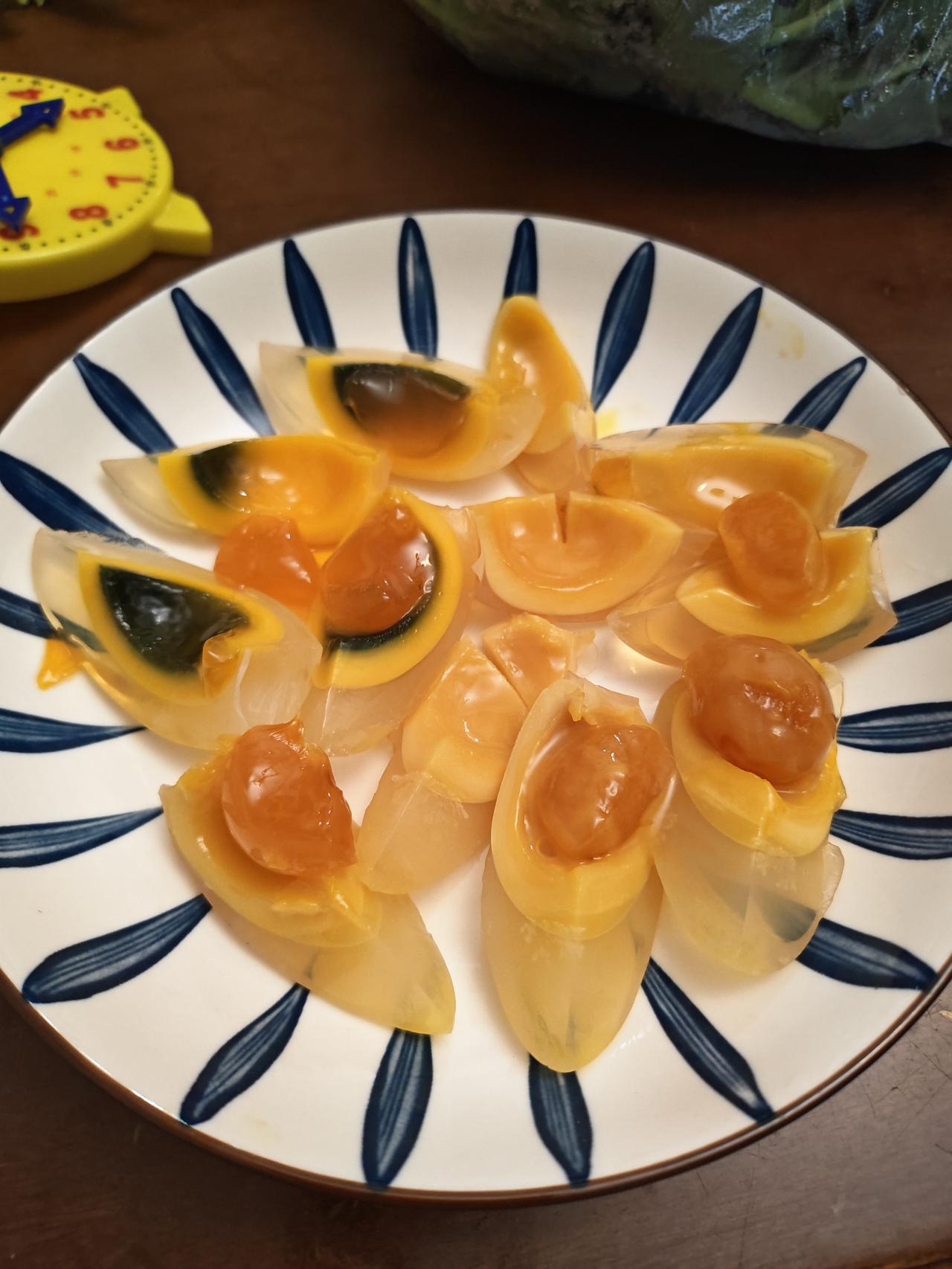 这次从老家带回来18个皮蛋,是自家的鸭子生的蛋,然后爸爸带到场上去包的。今天中午剥了三个,惊喜的是上面还有松花,并且是这种黄色,黑色的皮蛋我不吃。吃起来口感很好,一点也不会钾口,还是小时候的味道。真的觉得我们阆中这种黄心皮蛋很好吃。阆中 皮蛋