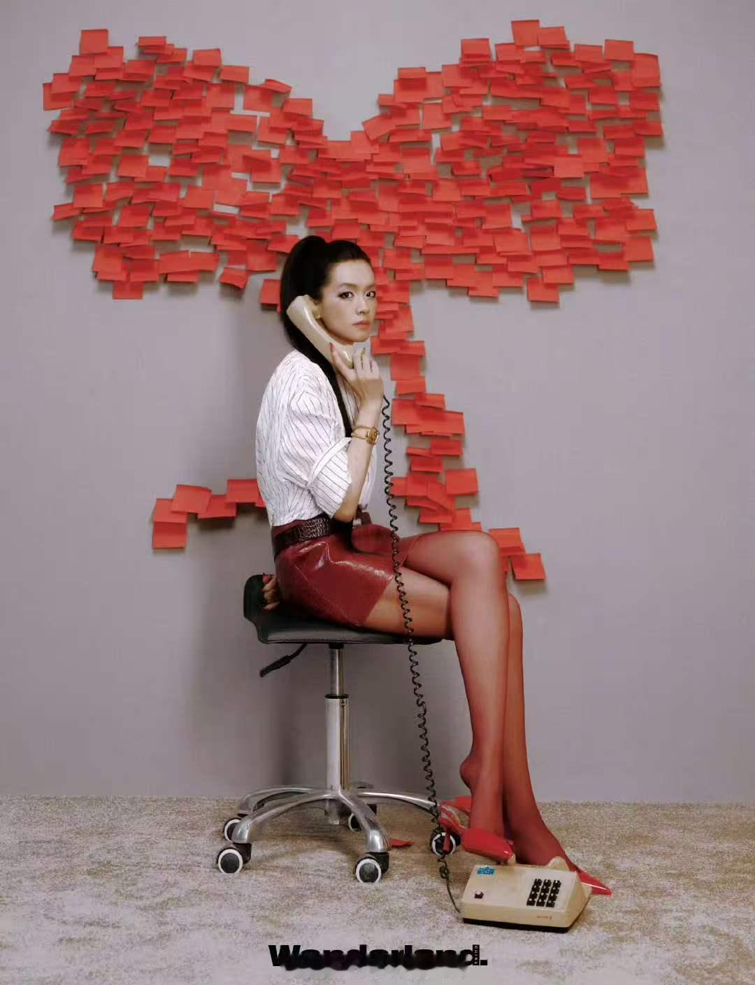 画面中的林青霞皓肤如玉,棕色马尾丝滑如缎,修项秀颈,青春气息扑面而来;玉腿纤纤,
