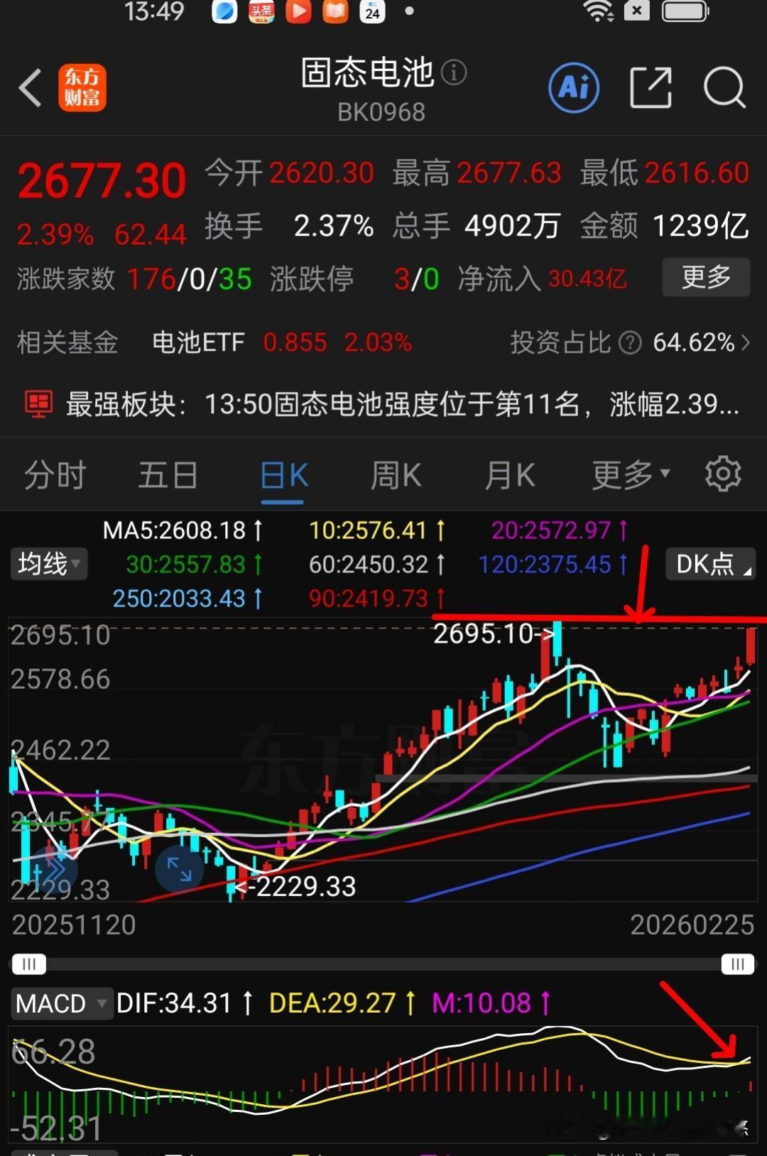 固态电池与中证电池这样做? 今天整个电池板块在能源金属带动下集体反弹,固态电池(下图二所示)目前已经到了前期高点压力位,是否继续上行突破过去,有待观察,不过macd刚刚金叉状态,继续上行是大概率。 中证电池(下图一所示),现在突破多条均线压力,中证电池弱于固态电池,目前距离前期高点压力位还有一定距离,到了前期整理颈线区域,这个位置套牢盘比较多,可以持仓待涨,也可以适当分期止盈减仓。