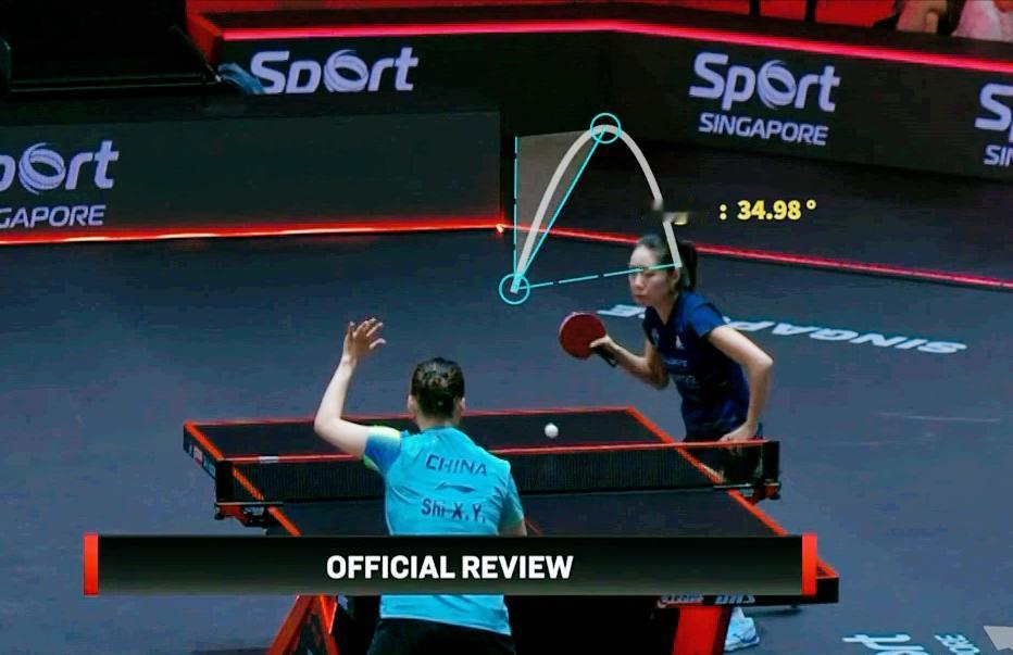 突发!石洵瑶请求了鹰眼! 今天张安和石洵瑶的比赛中, 已经被裁判判了2个发球回抛, 她自己挑战鹰眼都失败了。 第三局石洵瑶又主动挑战鹰眼, 结果还是34度多, 说明张安发球存在很大问题。 最后石洵瑶3:0战胜了张安, 石洵瑶不过下一场对战孙颖莎, 大概率要止步了。