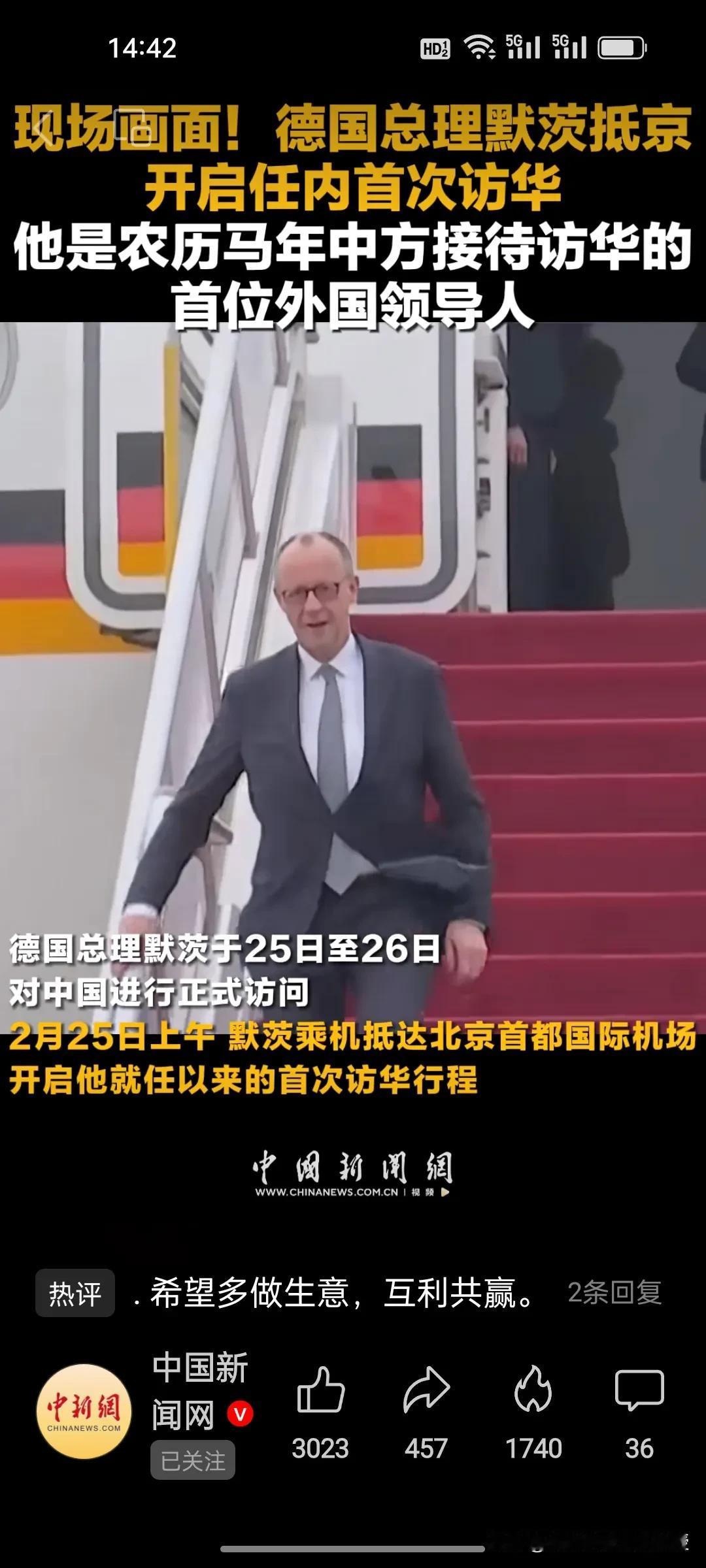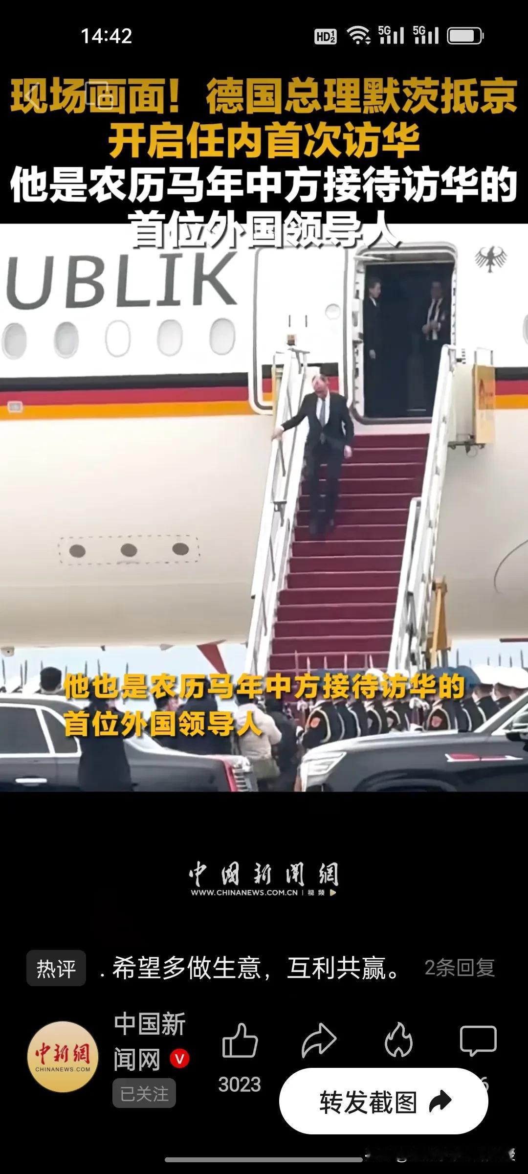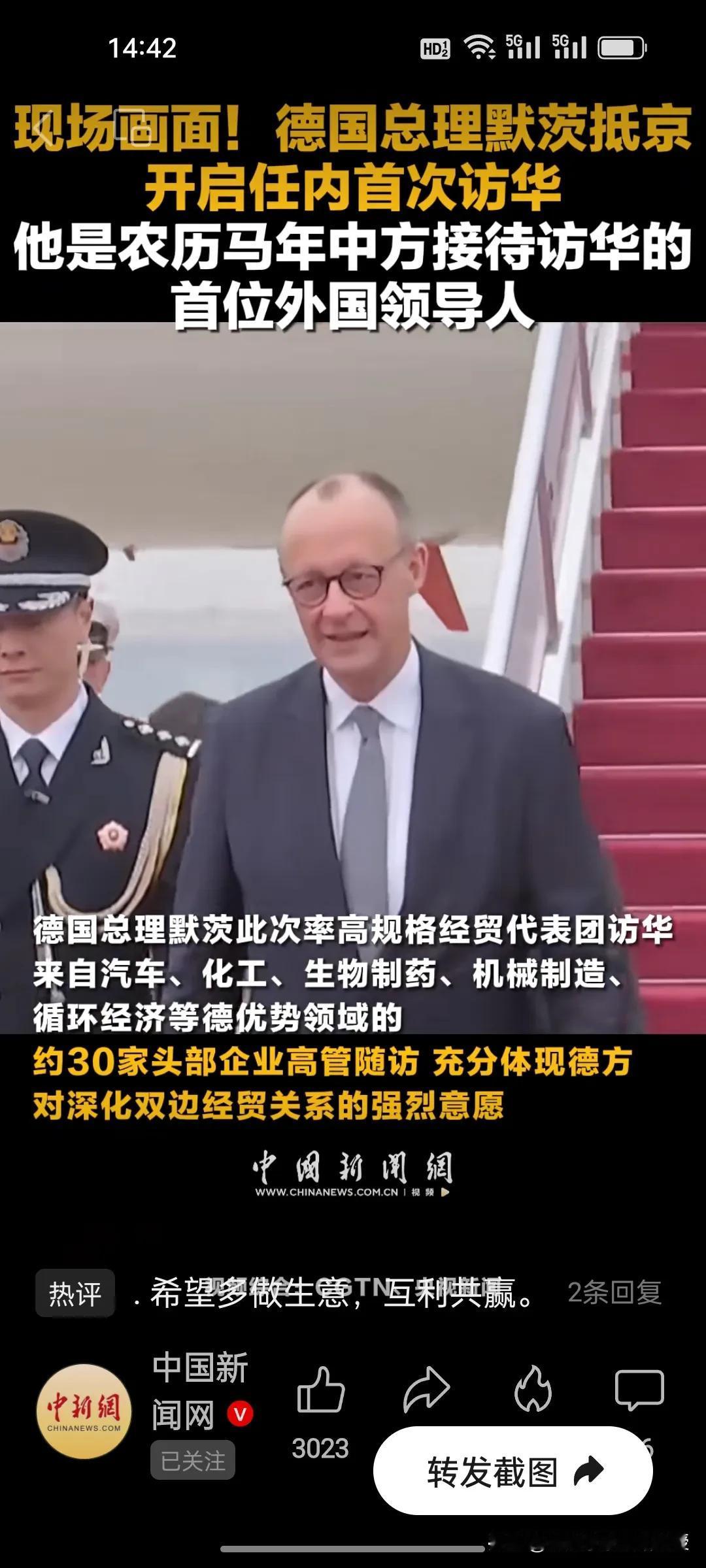 现场直击!默茨专机抵达后小跑下飞机,马年首访释放强烈信号! 今天,德国总理默茨的专机刚在首都机场停稳,他便快跑两步出舱,小跑着踏上红地毯。这一细节,成为马年中方接待的首位外国领导人最直观的访华姿态。 他率约30家德企高管随行,涵盖汽车、化工等优势领域,彰显德方深化合作的迫切。 默茨务实赴约、直奔合作,中德以行动锚定共赢,马年双边经贸合作势必提速!