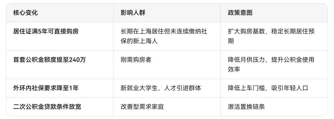 上海出了楼市新政↓。 简单总结主要两点: ①买房人基数大了。 新就业大学生、人才引进群体、长期居住但没缴纳社保人群。 ②贷款条件也优化了。 公积金贷款额从120万→240万。 过去400万的二手房,从高点回调40%后,就是240万的上车线。 与此同时,公积金贷款利率2.6%。 算个账会显得更直观一些: 400万的二手房跌40%→240万 240万总价 × 80%贷款→192万 可全用公积金覆盖(家庭额度240万) 192万-30年-2.6%→月供7700元 对比3-5年前的情况:   总价400万,首付30%→120万 280万,利率4.2%→月供13700元