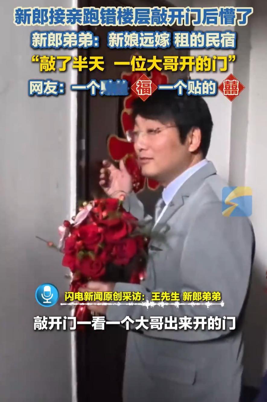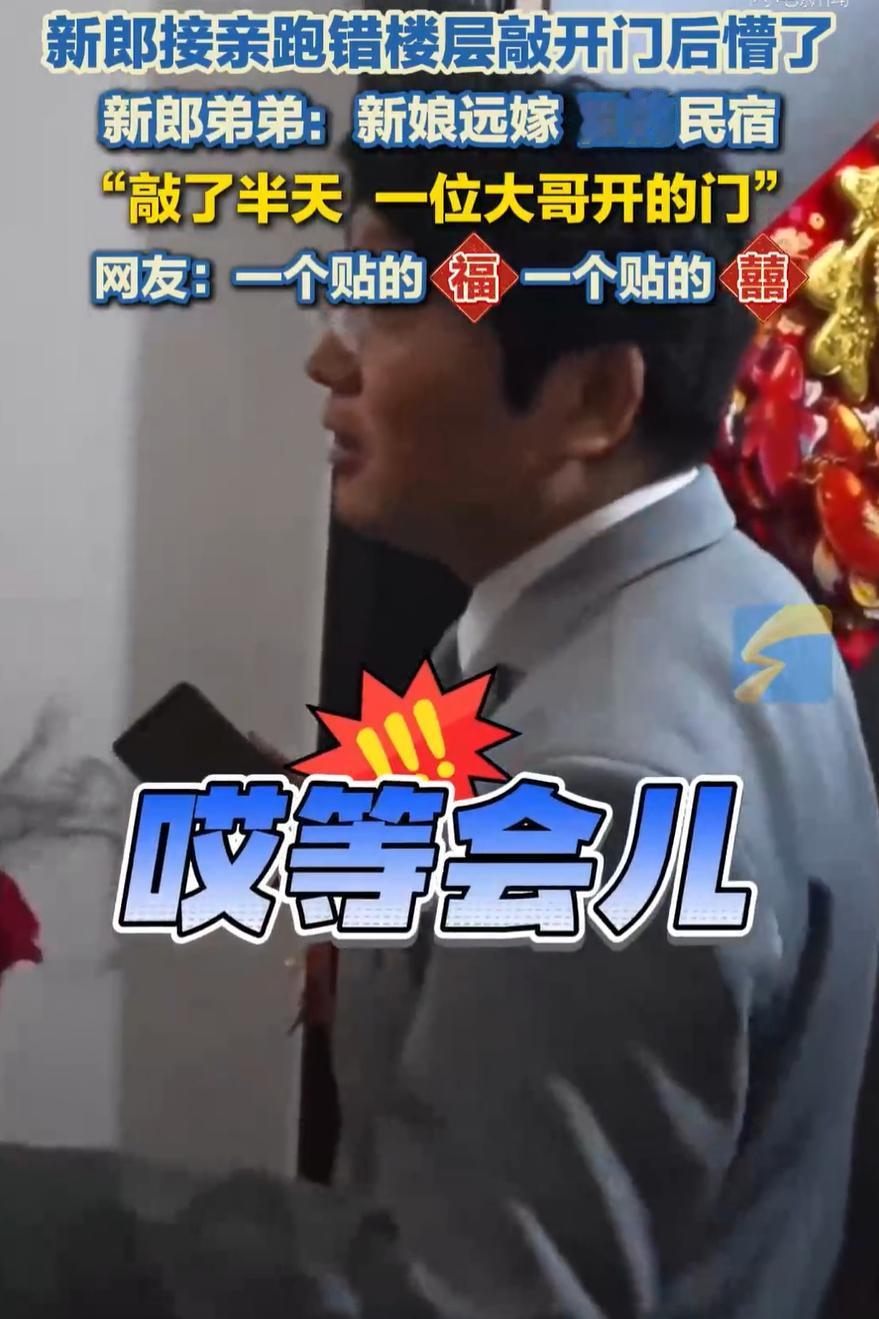 这也太尴尬了!河南信阳,一对新人结婚,可新郎带着亲戚去接亲时,开门的却是一名陌生男子,新郎再一看手机,问了句楼层,才发现是自己走错了楼层敲错门。网友:一个贴的“福”,一个贴的“囍” 当天,当天新郎打扮得精神抖擞,手里捧着花,身后跟着一群亲戚朋友,浩浩荡荡就进了单元楼。大家说说笑笑,气氛搞得挺足,就等着到新娘家门口被伴娘拦一拦、闹一闹 到了门口,新郎敲门。门很快就开了 新郎还没来得及高兴,就发现不对劲,开门的是个陌生大哥,穿着随意,手里还拿着手机,一脸茫然地看着门外这群人。新郎也懵了,手捧花都不知道往哪儿放 两个人就这么对视了几秒钟,空气都凝固了 新郎这才反应过来,看了一眼手机,问了问朋友:哎,等会,这不是六楼吗?朋友告诉他,这是四楼,一行人这才意识到走错了楼层 新郎弟弟事后解释,倒不是哥哥不认路,而是因为新娘是远嫁来的,房子是他们租的民宿,所以哥哥还不太认路,闹出了一个大乌龙 有网友调侃:开门的大哥估计得缓好一会儿才能想明白刚才发生了什么。 想想那位大哥也挺冤的,好好在家待着,突然门外站了一群敲锣打鼓的人,还都穿得整整齐齐,捧着一大束花,换谁都得愣一会儿 我觉得这个事也是个提醒,结婚接亲这事儿,细节真得提前踩好点。尤其是租的房子或者酒店,最好提前去看一眼,记住楼层和门牌号,免得当天人多事杂,闹出这种乌龙。毕竟谁也不想在新娘门口被自己尴尬到 不过话说回来,这种事虽然当时尴尬,过后想想也是个笑料。等以后两口子吵架了,把这事翻出来说一说,说不定还能缓和一下气氛。毕竟能让老公在结婚当天就闹出这么大乌龙的新娘,可能也就这一位了