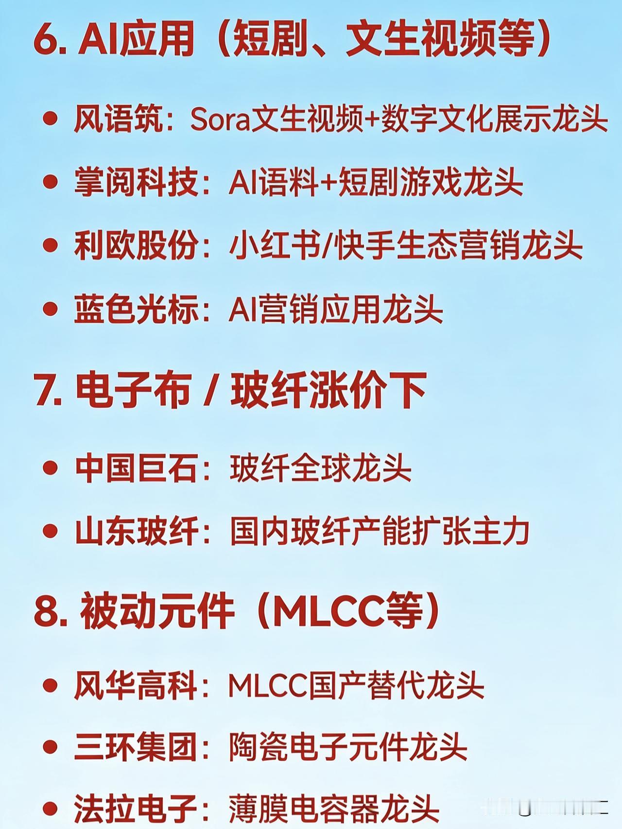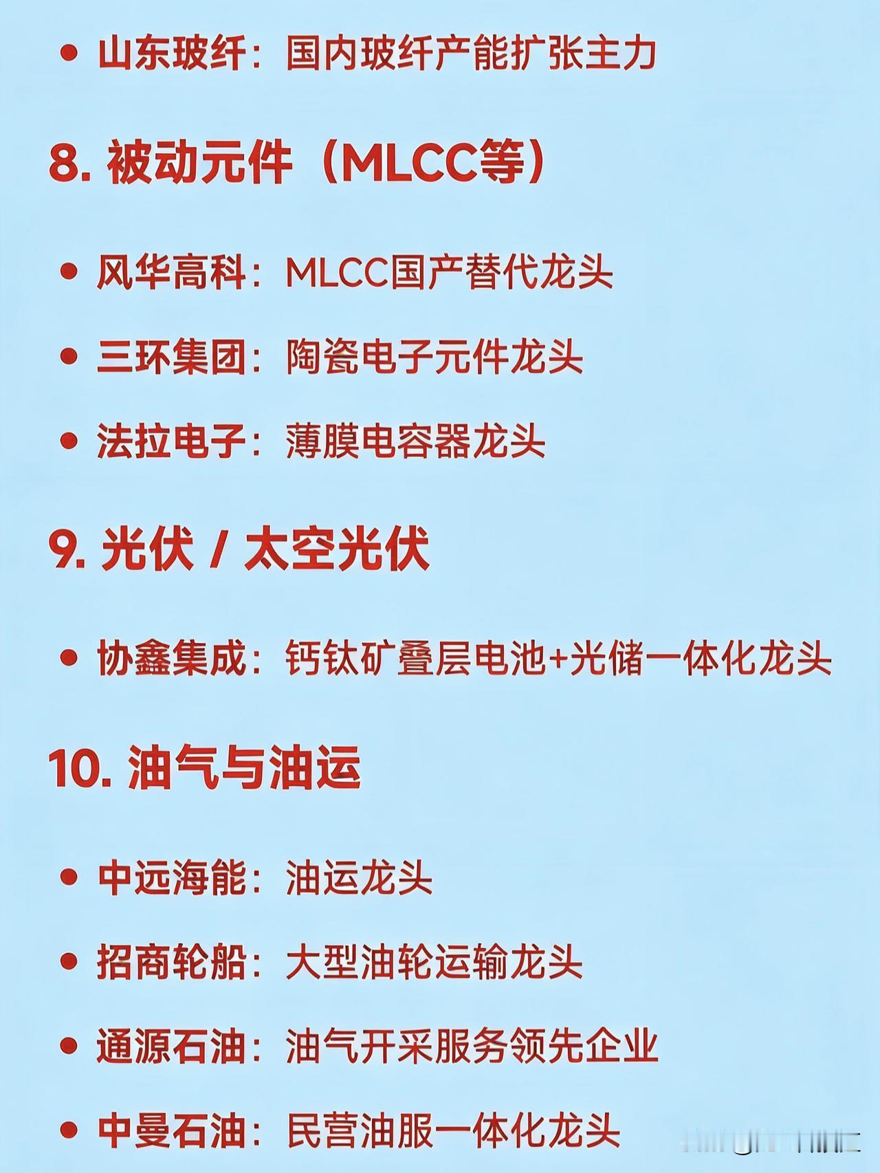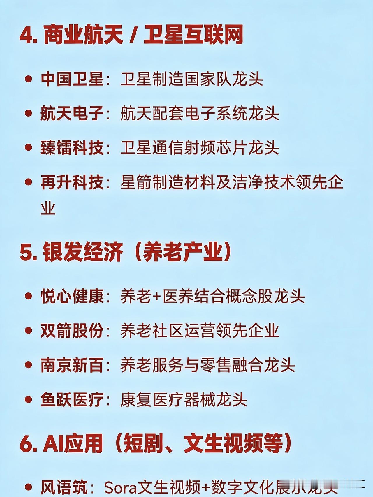 2026年2月25日十大热点科技及其产业链核心龙头 1. AI算力与光模块 中际旭创:全球光模块龙头 新易盛:高速光模块弹性龙头 天孚通信:光器件隐形冠军 华工科技:AI高速光模块龙头企业 2. 人形机器人 三花智控:人形机器人热管理系统龙头 绿的谐波:谐波减速器绝对龙头 双环传动:RV减速器龙头 百达精工:机器人整机结构件领先企业 天奇股份:机器人整机及智能装备龙头 3. 存储芯片 深科技:先进封装与存储模组龙头 兆易创新:NOR Flash全球龙头、DRAM重要厂商 北京君正:车用存储芯片龙头 江波龙:国产存储模组龙头 4. 商业航天 / 卫星互联网 中国卫星:卫星制造国家队龙头 航天电子:航天配套电子系统龙头 臻镭科技:卫星通信射频芯片龙头 再升科技:星箭制造材料及洁净技术领先企业 5. 银发经济(养老产业) 悦心健康:养老+医养结合概念股龙头 双箭股份:养老社区运营领先企业 南京新百:养老服务与零售融合龙头 鱼跃医疗:康复医疗器械龙头 6. AI应用(短剧、文生视频等) 风语筑:Sora文生视频+数字文化展示龙头 掌阅科技:AI语料+短剧游戏龙头 利欧股份:小红书/快手生态营销龙头 蓝色光标:AI营销应用龙头 7. 电子布 / 玻纤涨价 中国巨石:玻纤全球龙头 山东玻纤:国内玻纤产能扩张主力 8. 被动元件(MLCC等) 风华高科:MLCC国产替代龙头 三环集团:陶瓷电子元件龙头 法拉电子:薄膜电容器龙头 9. 光伏 / 太空光伏 协鑫集成:钙钛矿叠层电池+光储一体化龙头 10. 油气与油运 中远海能:油运龙头 招商轮船:大型油轮运输龙头 通源石油:油气开采服务领先企业 中曼石油:民营油服一体化龙头