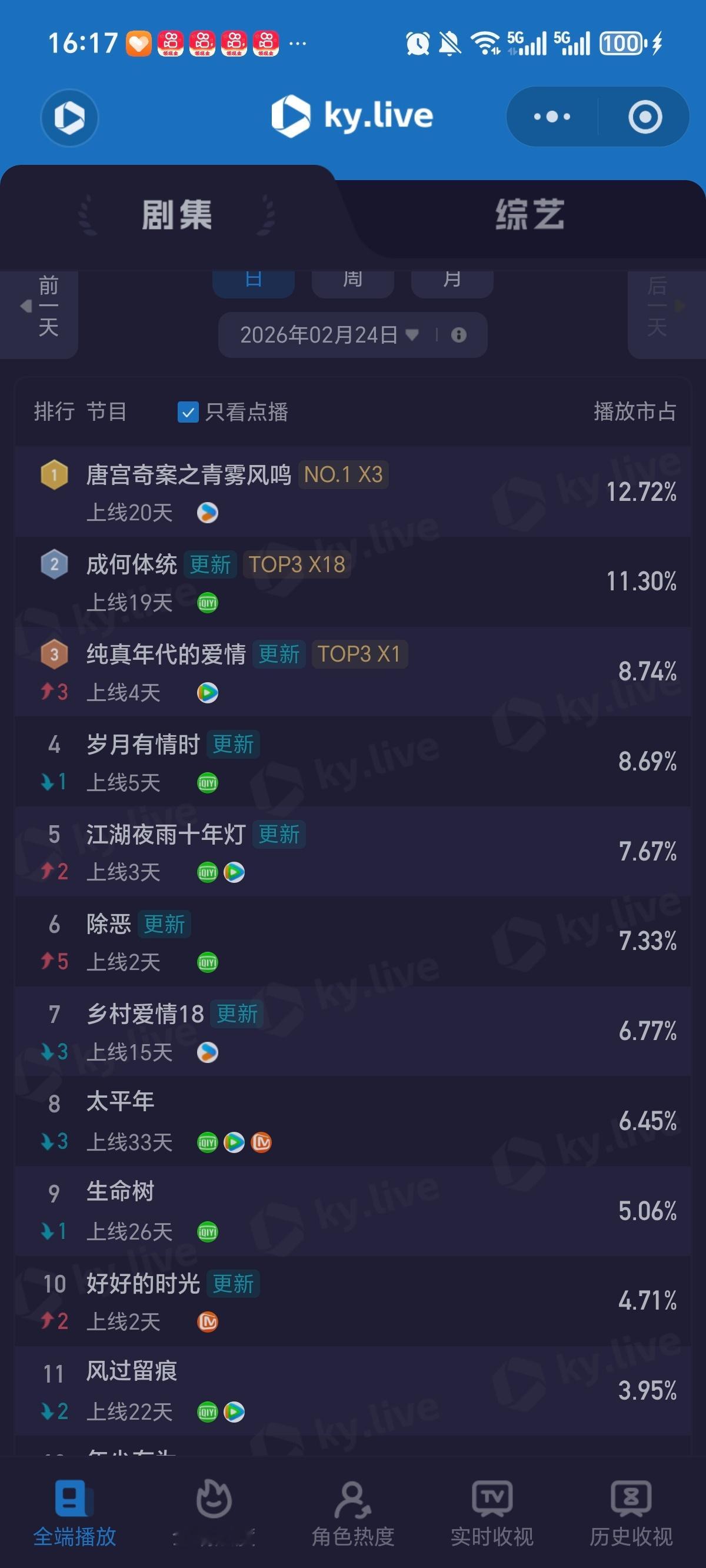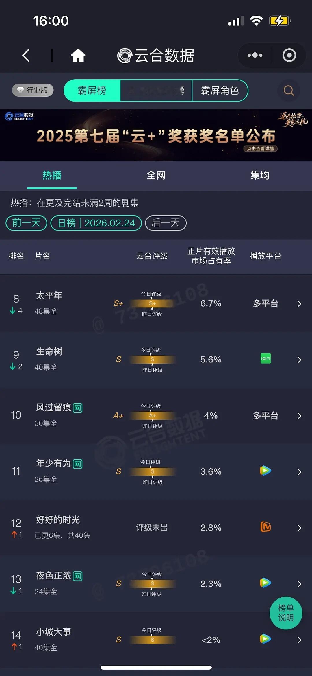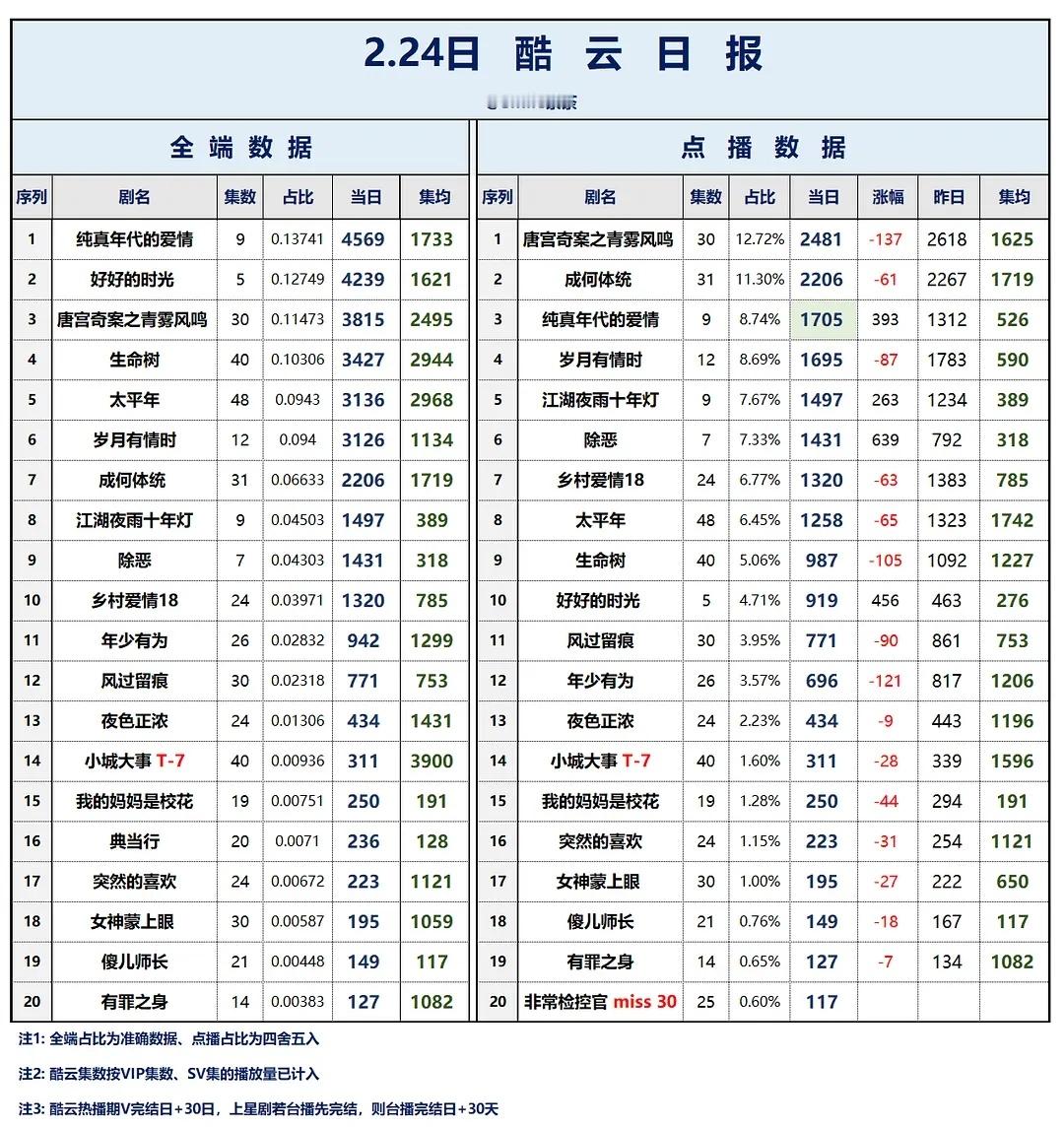 云合大盘1.65+纯真年代 8.9% 1450+ 缓慢涨目前还是集均1000+江湖 7.1% 1100+ 古偶大ip近几年扑最惨的好好的时光2.8% 400+ 看收视吧,小巷人家是奇迹酷云差不多 好好的时光酷云相比云合高不少,不是反过来