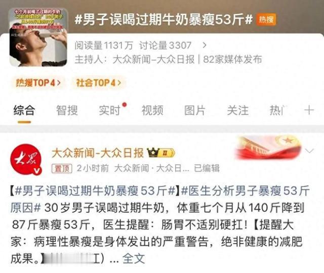 2月24日,一30岁男子7个月前误食过期牛奶后,接连出现腹胀、腹痛和持续便秘,短短数月体重暴跌53斤。