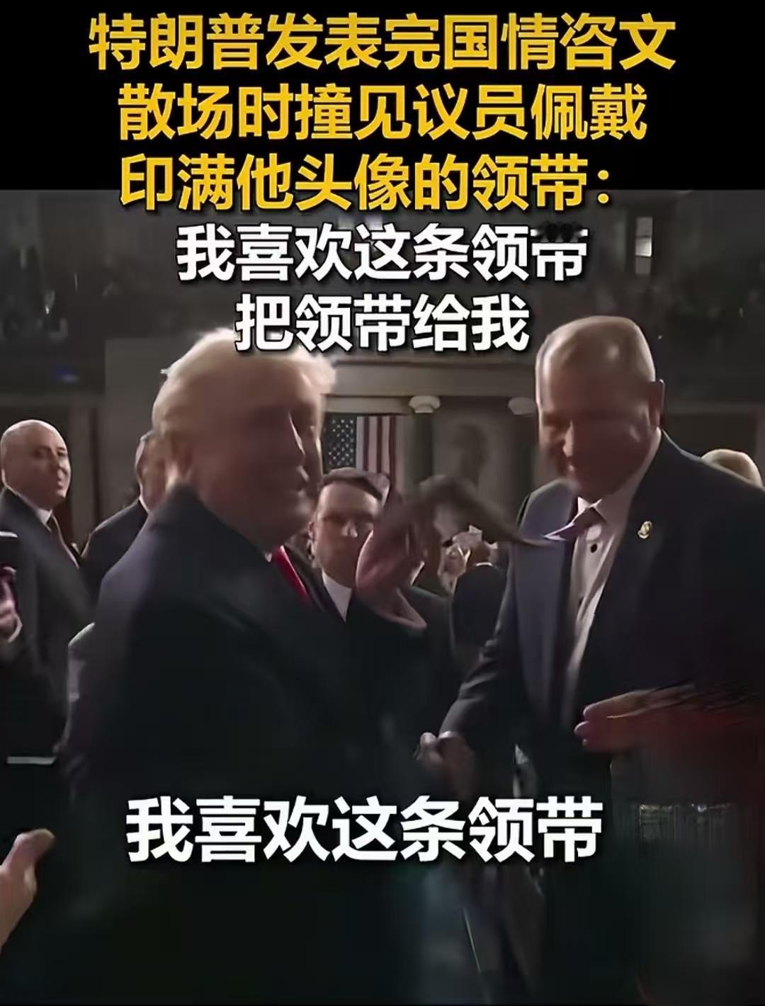 谁再说西方没人情世故?我跟谁急! 刚刷到个大新闻,特朗普在国会发表完国情咨文,散场时一眼就盯上了一位议员的领带,那领带上面,全是他自己的头像! 然后你猜怎么着?特朗普直接伸手:“我喜欢这条领带,把领带给我。”议员当场拿出笔让他在领带上签了字。 这画面,我直接笑喷了。以前总听人说,西方政治是“理性、透明、不讲人情”,现在看来,这人情世故玩得比谁都溜啊! 其实美国国会里,17%以上的议员来自议员世家,700多个家族至少向国会输送过两名成员,这叫“不讲人情”? 国会议员平均净资产是普通美国家庭的12倍,炒股议员的回报率比市场平均高12%,这叫“公平竞争”? 2025年民调显示,仅39%的美国人认可特朗普的执政表现,可共和党议员们照样把他的头像印在领带上,这叫“代表民意”? 以前公知们总说:“你看人家美国,多讲规则,多讲实力。”现在我算明白了,他们讲的“规则”,就是谁的头像印得多,谁的腰弯得快。 他们讲的“实力”,就是谁能把总统的头像印在领带上。谁就牛。 最后灵魂拷问:如果爱因斯坦穿越到今天的国会山,看到议员们戴着印满特朗普头像的领带,他是会点头哈腰要签名,还是直接掏出相对论说:“还是我这个更值钱?”你觉得呢?聊特朗普 特朗普乱政