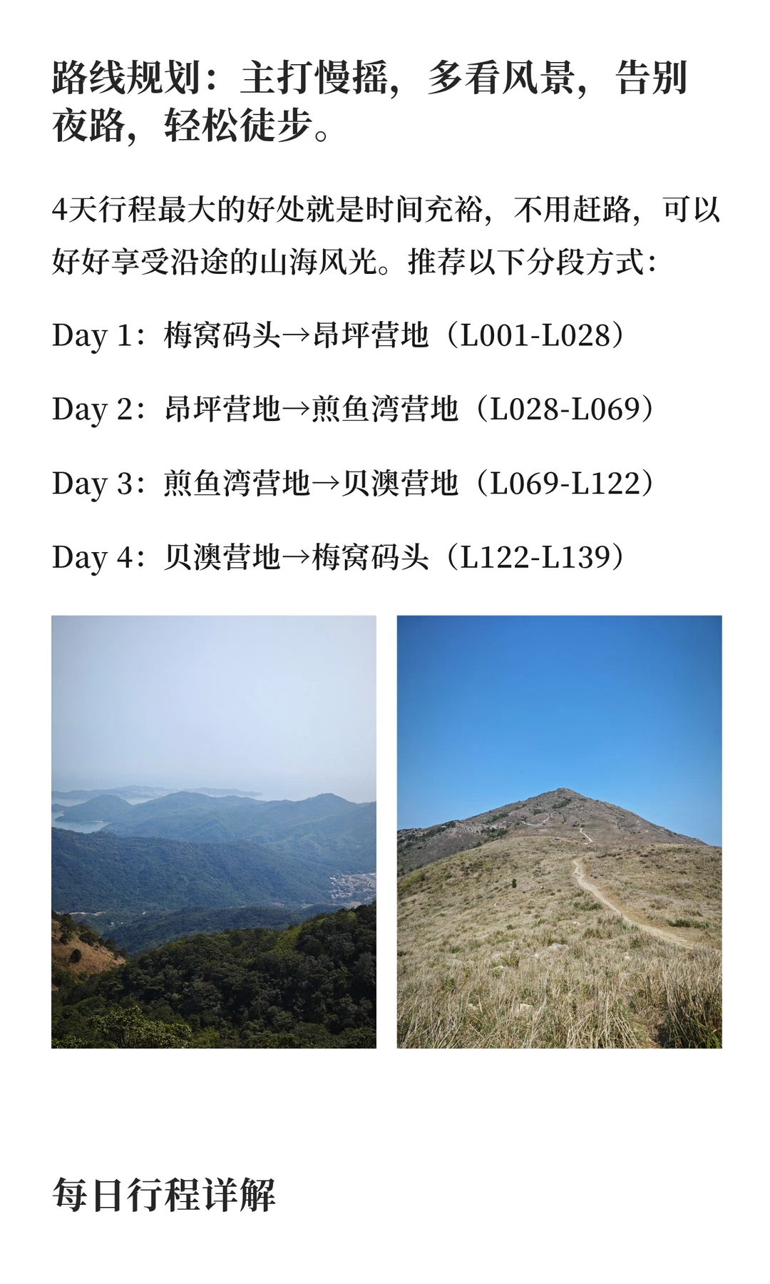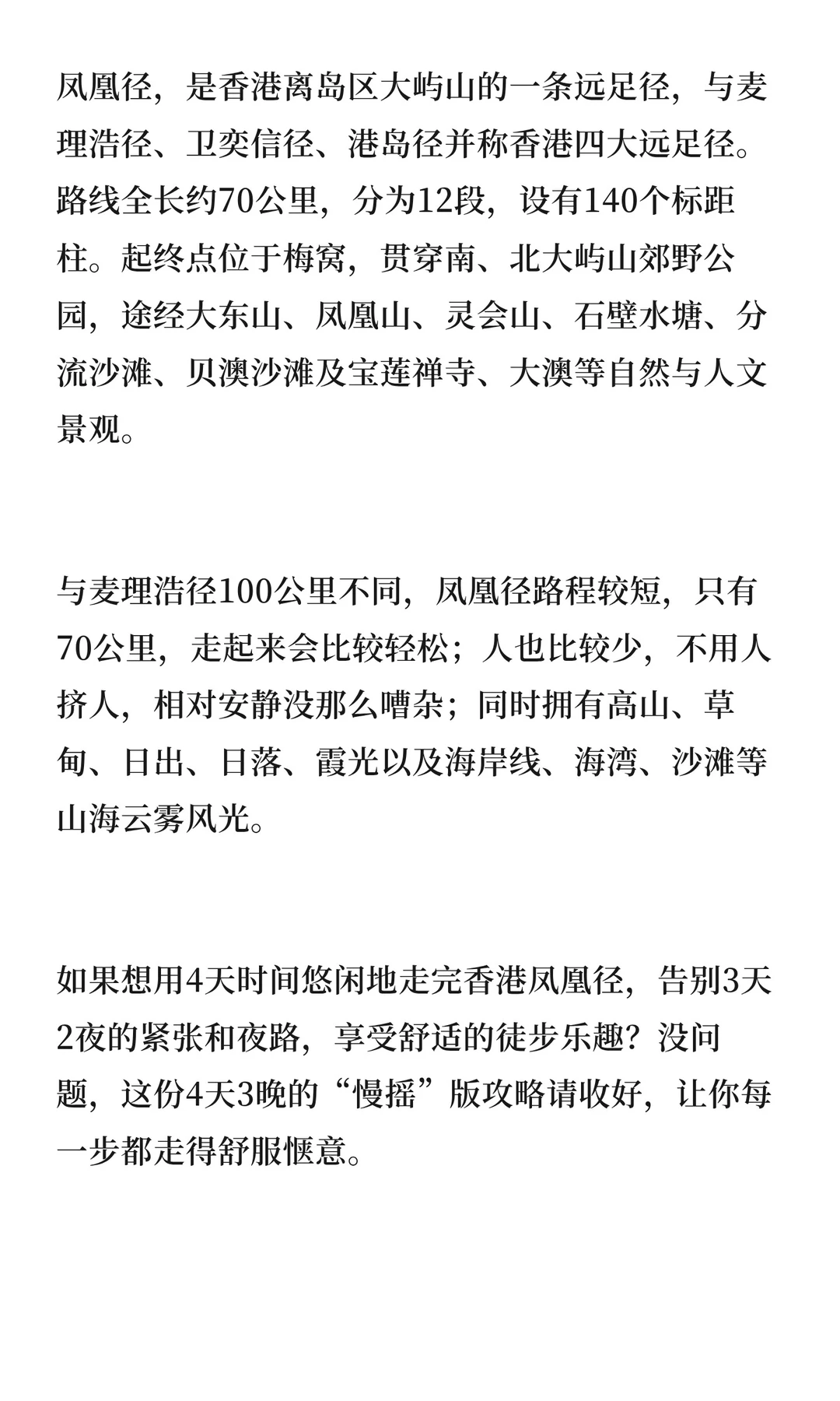 凤凰径是香港大屿山的70公里远足径,分为12段,途经大东山、凤凰山等景点。推荐4天3晚的慢摇版行程,避开高峰,享受山海风光。每段设有补给点和露营地点,适合徒步爱好者探索。