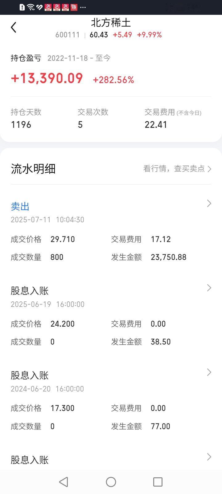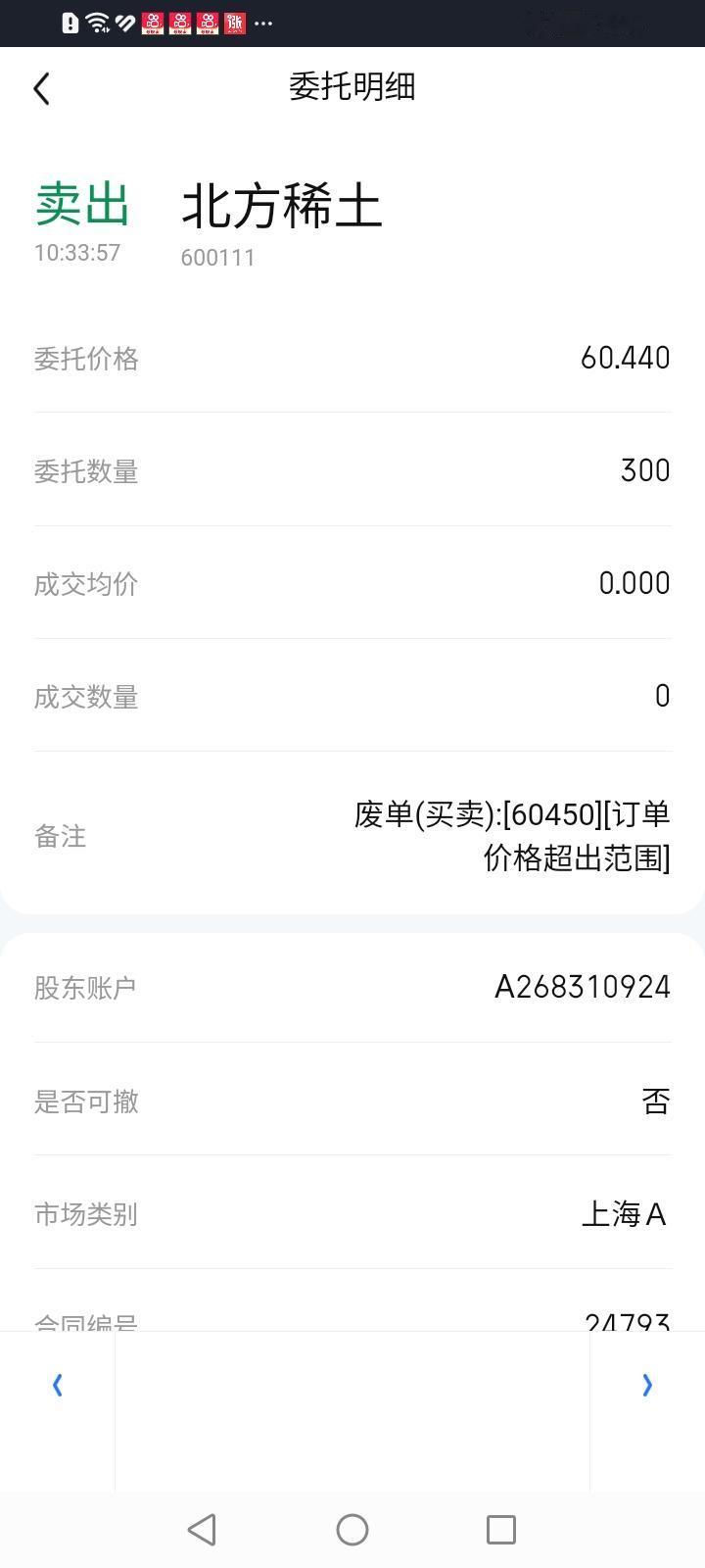 今天卖出北方稀土竟然闹了个可笑、可喜又好玩的乌龙指。 上午10:30左右看北方稀土涨势凌厉,就稀里糊涂的挂了个卖出北方稀土的卖单,卖出价60.44元。中午收盘一看,北方稀土涨停了,但咱却没卖掉,仔细一看,原来咱挂的卖出价60.44元竟然比涨停价高了一分钱,成了废单。 既然北方稀土敢强势封涨停,咱也就干脆将错就错不卖了,拿着看看再说吧。难道北方稀土还有再创历史新高的潜力?
