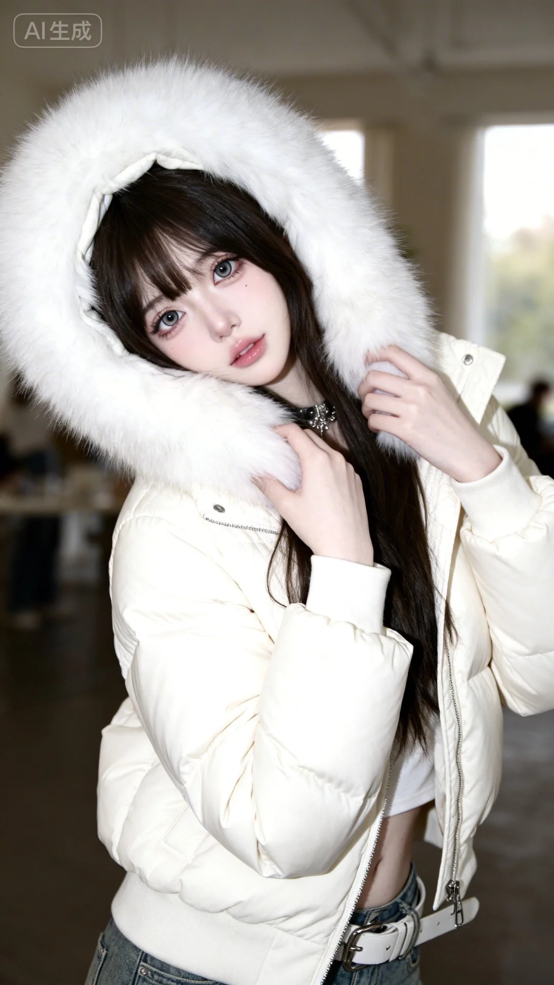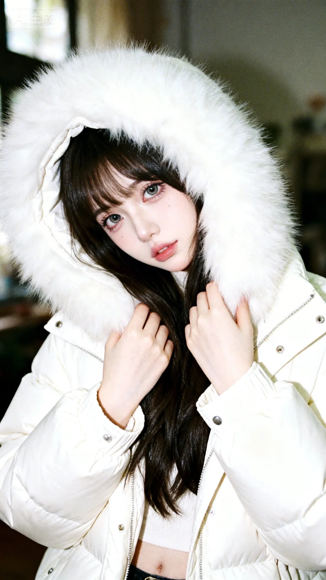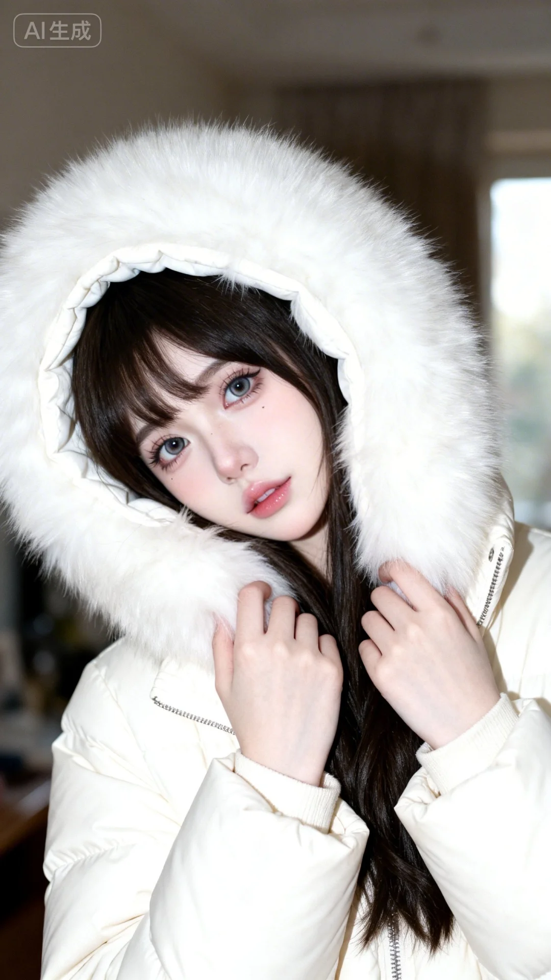..超高颜值美少女,网感头像,瓷白肌肤、奶油白肌肤,无辜大眼睛,微醺,自然松弛,doll妆,洋娃娃般可爱,可爱纯欲感,网感妆,自然光线,暖调滤镜,少女感网拍,室内场景,随手一拍的快照效果,极其平凡无奇且刻意的平庸感,仿佛拿手机不经意间拍下的照片,黑茶色长发,歪头,表情甜美娇羞,超高颜值美女情绪氛围感,INS风,写意,前卫艺术,细节丰富,高级感,杰作,柔光滤镜,背景模糊,营造柔和朦胧氛围(光影细腻)的女性人像,看镜头,概念风美学,独特韵味的美,随意姿势,整体散发着前卫小众的气质,设计富有个性,穿白色带帽羽绒服(帽子超大白色蓬松真毛领),双手摸毛领靠脸颊,整体穿搭风格小众且极具辨识度,细节处的配饰与服装风格浑然一体。她姿态随性,整体姿态传递出一种沉浸在自我风格中的独特韵味,尽显软萌气质,高颜值。