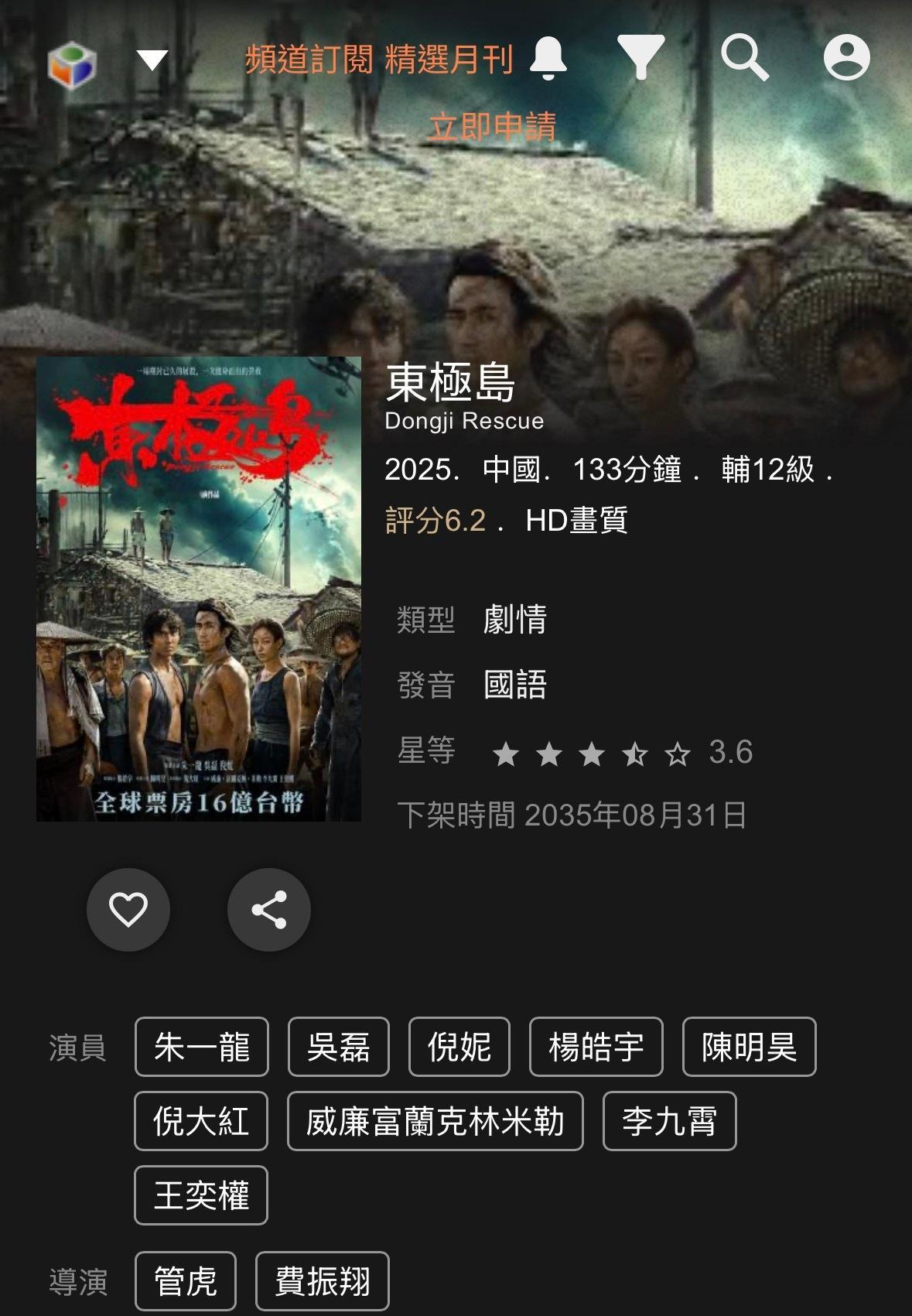 【台湾资讯:电影东极岛台湾播出 】朱一龙、吴磊、倪妮领衔主演,杨皓宇特别出演,陈明昊特别主演的剧情电影《电影东极岛 /東極島》已于12月19日台湾地区OTT中华电信MOD、Hami Video,已于02月20日远传friDay影音、Google Play、MyVideo、CATCHPLAY+、LiTV立视线上影视播出。