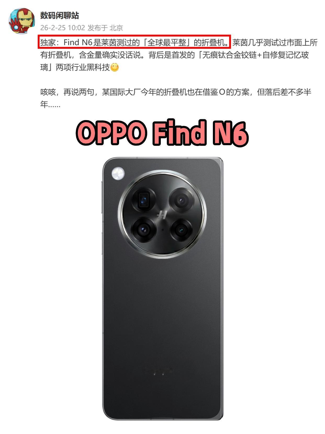 苹果下场折叠屏!开局却遇上OPPO大BOSS? 汇总各路爆料,苹果第一款折叠屏,基本就是今年登场了! 之前一直传苹果要做无折痕,现在也有新料了,iPhone Fold折痕控制在0.15mm以内,折痕角度小于2.5度,这个数据很夸张了啊,不过就还是价格问题,听说要上2w,也是很离谱了 看闲聊站爆料,苹果这个技术用的好像是OPPO的方案哦?就是即将发布的Find N6同款,无痕钛合金铰链从物理层面消除折痕,自修复记忆玻璃抚平表面微痕,两大黑科技加持直接拿下莱茵全球最平整折叠机认证 而且OPPO这款还不止屏幕有黑科技,其它配置也都有大升级,从外观渲染图也能看的出来,2亿像素+哈苏四摄安排上了,要跟直板机比影像。系统软件的适配也不用说,OPPO一直做的很不错,这次听说还有AI手写笔功能优化生产力体验,感觉会是大爆款啊 感觉2026年折叠屏的主基调就是“无折痕”了,OPPO Find N6下个月先发,独占半年后再由苹果接棒,折叠屏市场要卷飞咯,大家怎么看?