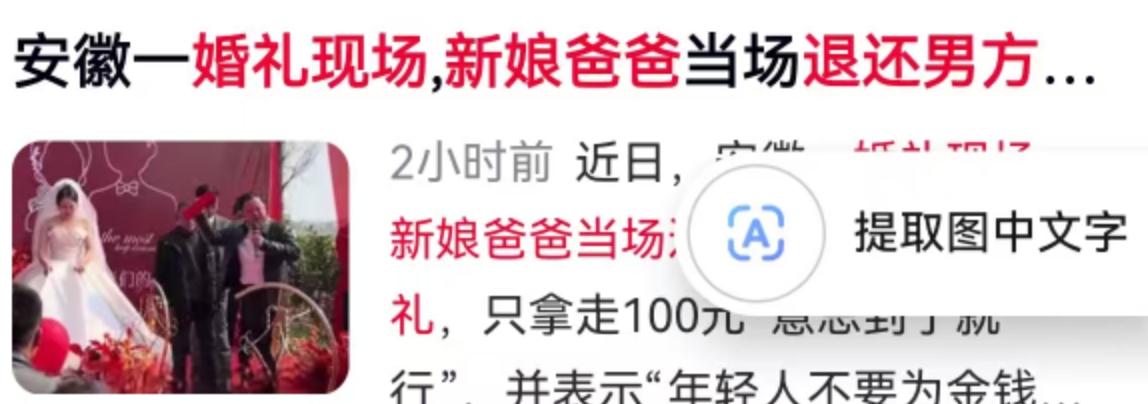 2月14日,安徽的一场婚礼现场,一段视频让无数网友在这个充满爱意的日子里,看到了比鲜花和誓言更珍贵的东西。 婚礼的高潮并非司仪煽情的致辞,而是新娘父亲的一个举动。在众目睽睽之下,这位父亲没有按照惯例先夸女婿、叮嘱女儿,而是从身边人手中接过一个厚厚的红色信封。那是男方家庭之前送来的18万8千元彩礼。全场宾客都以为这只是一个正常的展示环节,接下来的一幕却让人始料未及:老丈人当场将这沉甸甸的18万8千元如数退还给了男方,自己只从中抽走了一张百元大钞。 面对台下的惊愕与掌声,他只淡淡地说了一句:“意思到了就行,年轻人不要为金钱蒙蔽了自己的婚姻。” 这简单的一句话,瞬间击中了无数人的心坎。 在如今不少地区,“天价彩礼”依然是横亘在年轻情侣面前的一座大山。18万8,对于许多普通家庭而言,可能是一辈子的积蓄,甚至是举债凑齐的“入场券”。多少感情因为彩礼谈不拢而分崩离析,多少亲家在谈判桌上红了脸、伤了情。而这位安徽父亲,用最实际的行动,给这场关于金钱的博弈画上了一个温暖的句号。 只拿走100元,是为了遵循传统礼数中的“讨彩头”,寓意百里挑一;退还18万8,是为了给小两口减轻负担,让他们轻装上阵。这一拿一退之间,尽显长辈的智慧与格局。网友们纷纷点赞:“这才是真的爱女儿!”“老丈人做出了拒绝彩礼的表率,格局打开了!” 这种爱,是深沉且理性的。他深知,女儿婚后的幸福,不取决于婚前亲家掏空家底拿出的那一沓钞票,而取决于小两口日子过得是否宽裕、是否有尊严。如果把彩礼当作一场对男方家庭支付能力的“极限测试”,最终买单的,往往是女儿婚后的生活质量。这位父亲看得通透,与其让这笔钱在两个家庭之间流转、甚至引发隔阂,不如把它变成小家庭的启动资金,变成女儿底气的一部分。 当然,我们也要看到,退还彩礼并非义务,而是一份情分。男方愿意拿出18万8,是诚意与尊重;女方愿意全额退还,是体谅与包容。这场婚礼最动人的地方,不在于钱的多少,而在于双方家庭达成的默契——为了这两个孩子的幸福,我们愿意互相成全。 在这个快节奏、有时略显功利的时代,这位父亲的做法无疑是一股清流。他用实际行动给所有准岳父岳母上了一课:爱孩子,就是为他们扫清不必要的障碍,而不是人为地设置门槛。毕竟,婚姻的本质是两个人的相濡以沫,而不是两个家庭的利益博弈。希望这样的“清流”能成为主流,让婚姻回归爱的本质。 以上内容仅供参考和借鉴