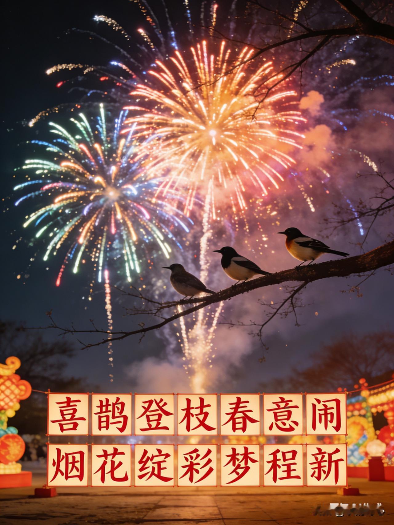 上联:喜鹊登枝春意闹 下联:烟花绽彩梦程新 “烟花”作为节日中常见的喜庆元素,绽放之际绚丽多姿,与喜鹊登枝的灵动场景相互映衬。“绽彩”一词生动展现出烟花绽放光彩的动态之美。“梦程新”寓意着开启新的梦想征程,象征着希望与美好,与上联中生机勃勃的春意相契合,传递出积极向上的情感。