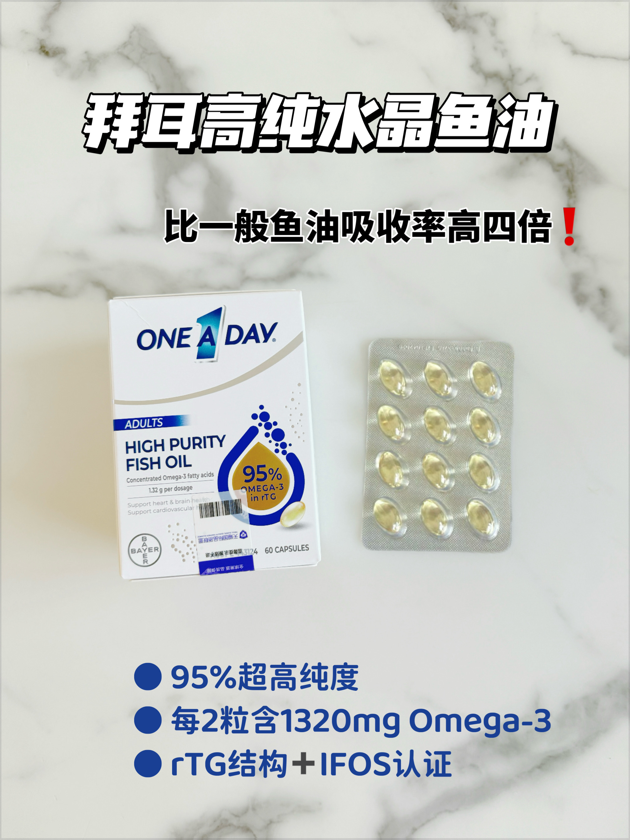 拜耳鱼油我每开团必囤,他们的鱼油纯度达95%,说明每粒鱼油都几乎只含有效成分omega3。其他低纯度的鱼油我是不建议吃的,含杂质太多,吃进去反而会造成额外负担。而且拜耳鱼油纯到透光,接近无色,只有高品质高纯度,而且完全无氧化的鱼油才能呈现出这种状态。每2粒1390mg含Omega-3有1320mg(其中EPA 695mg, DHA417mg),不仅含量高,One A Day鱼油还采用了rTG结构,比普通鱼油吸收率要高出四倍。而且这款颗粒小,不卡嗓子,独立包装携带出门也方便。