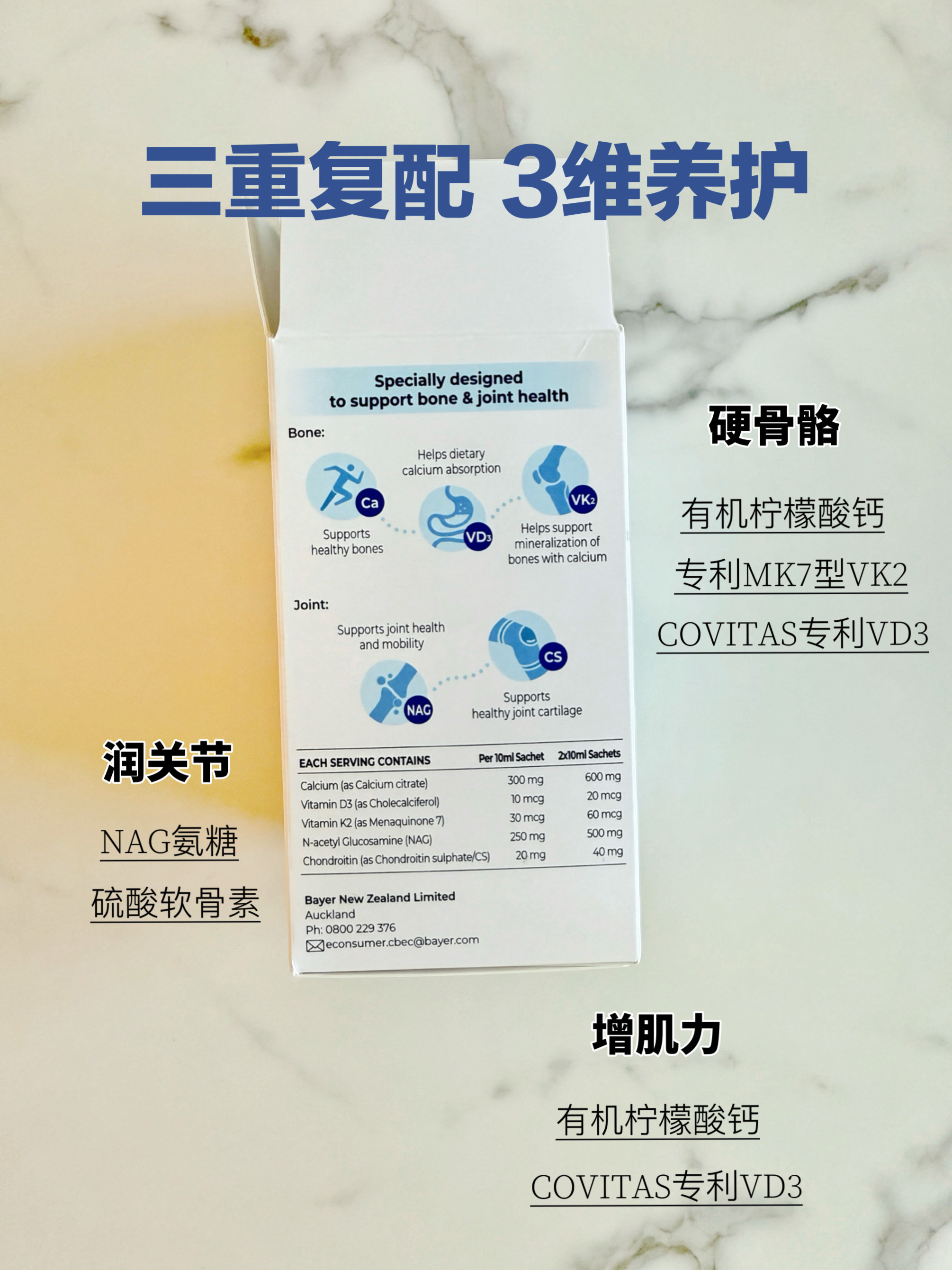 我妈前两年体检查了骨密度,显示骨量减少,医生建议她补钙。除了骨密度减少,她还有膝盖酸胀弹响,手指僵硬,手掌偶尔刺痛的毛病。看来看去最适合她的就是拜耳这款液体氨糖钙。拜耳液体氨糖钙每支含有600mg钙+800iu维生素d3+60mcgVK2+500mg专利NAG氨糖+40mg硫酸软骨素,从骨骼、关节和肌肉三方面同时补充营养,非常经常腰酸背痛,手指僵硬,膝盖疼痛的中老年人。