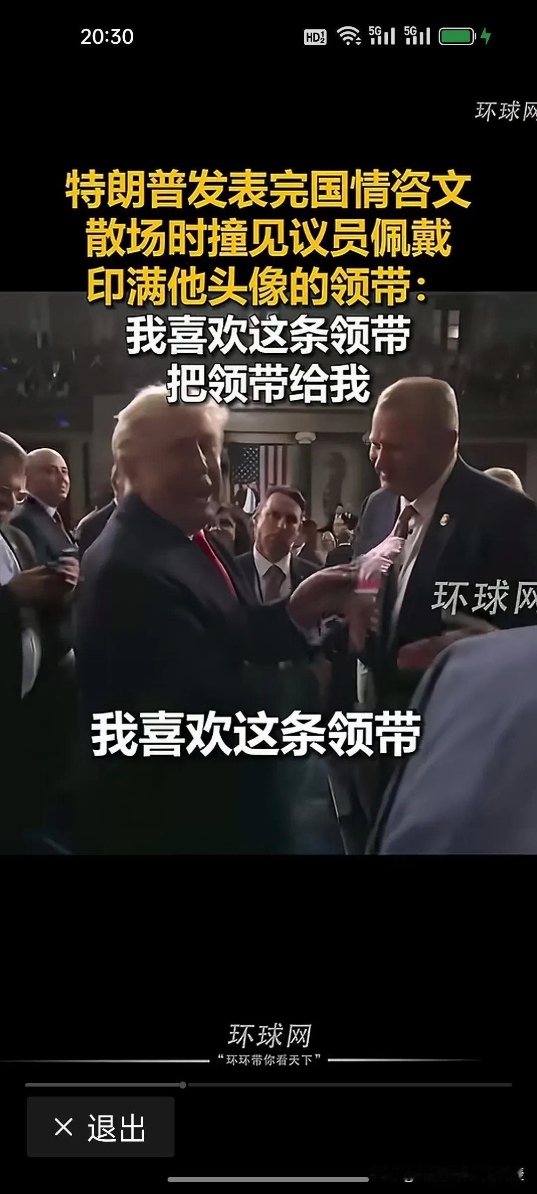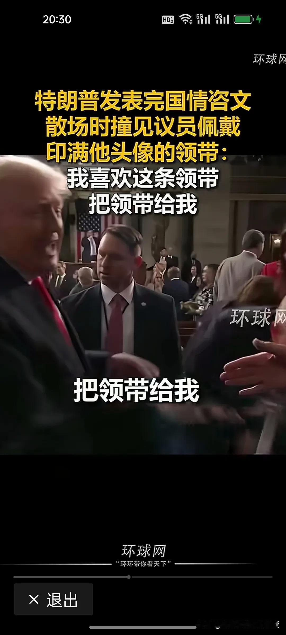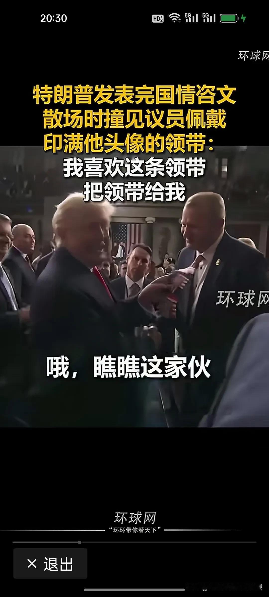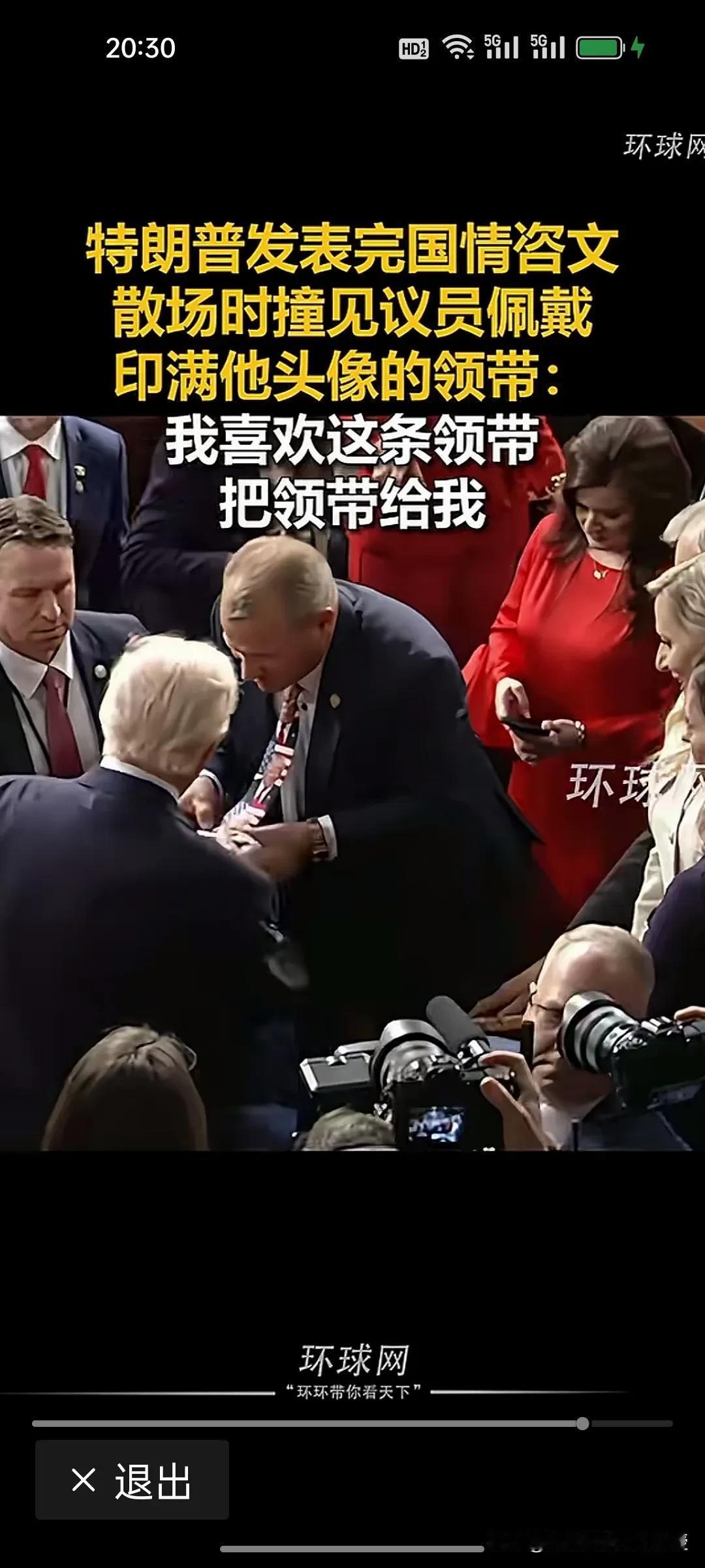 看下图,这应该是西方人情世故的“天花板”了!议员领带印满特朗普头像,还当场被特朗普看中了! 据《环球网》报道,昨天,特朗普发表第二任期内首场国情咨文后,散场时撞见一位议员佩戴着印满自己头像的领带,当场直言:“我喜欢这条领带,把领带给我。”这位议员立马拿了笔给特朗普在领带上签名。 这波操作堪称“拍马屁天花板”,直接把“偶像”头像焊在身上,直白得让人猝不及防。这么“硬核”的示好,连特朗普本人都忍不住调侃:“哦,瞧瞧这家伙。”特朗普心里满是欢喜,会不会立刻就给这位忠粉议员提拔了?还真不好说[大笑]