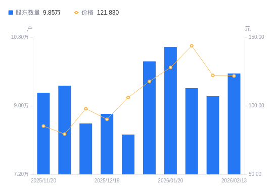 2月25日消息,数据显示,截至2026年2月10日,北京君正A股股东总户数为9.25万户,较上期(2026年1月30日)减少2128户,降幅2.25%。公司最新A股总股本为4.83亿股,其中流通A股4.21亿股,户均持有流通A股数量为4546.76股,较上期增加102.25股,增幅2.30%;户均持流通A股市值55.56万元,较上期减少8.36万元,降幅13.07%。