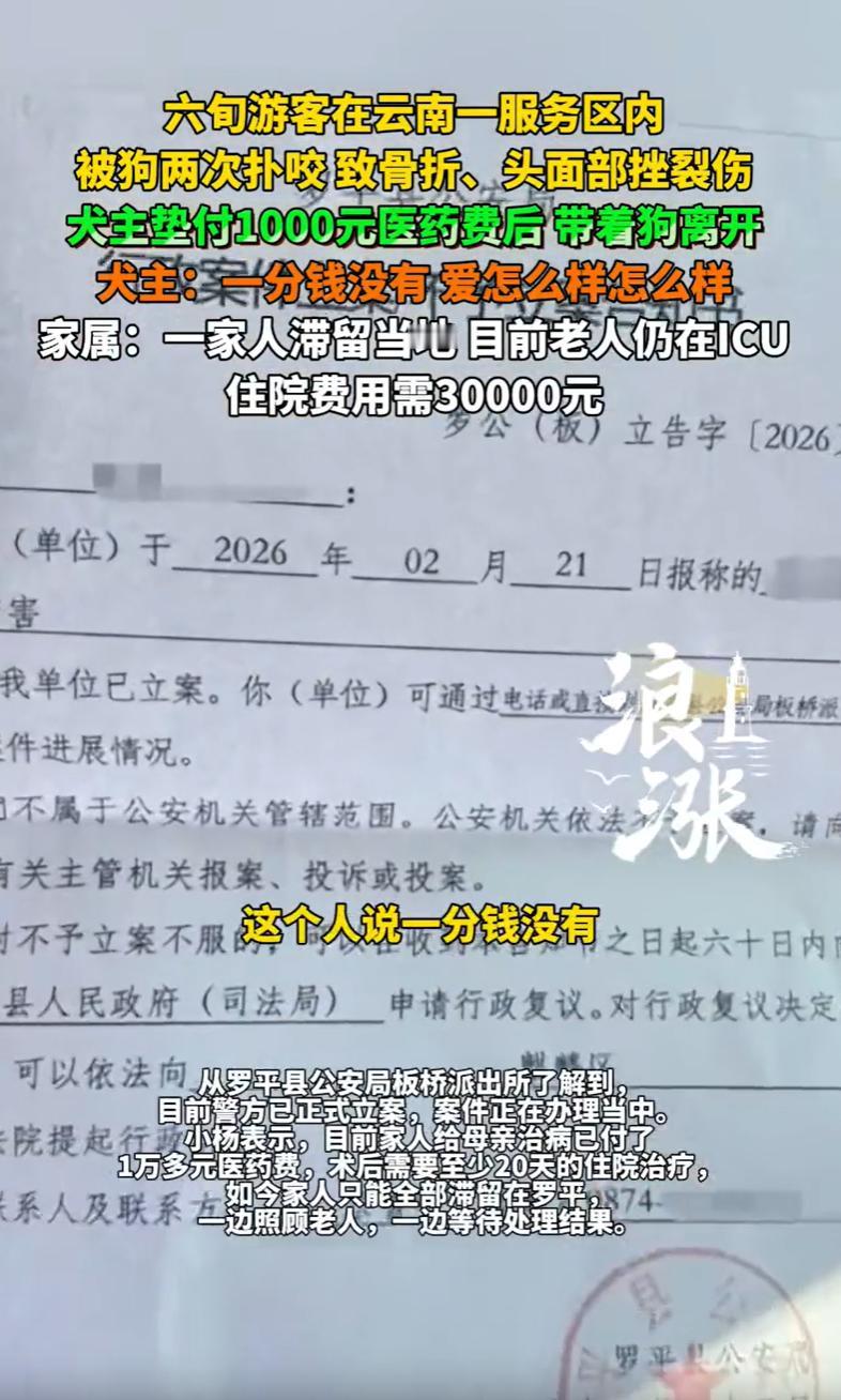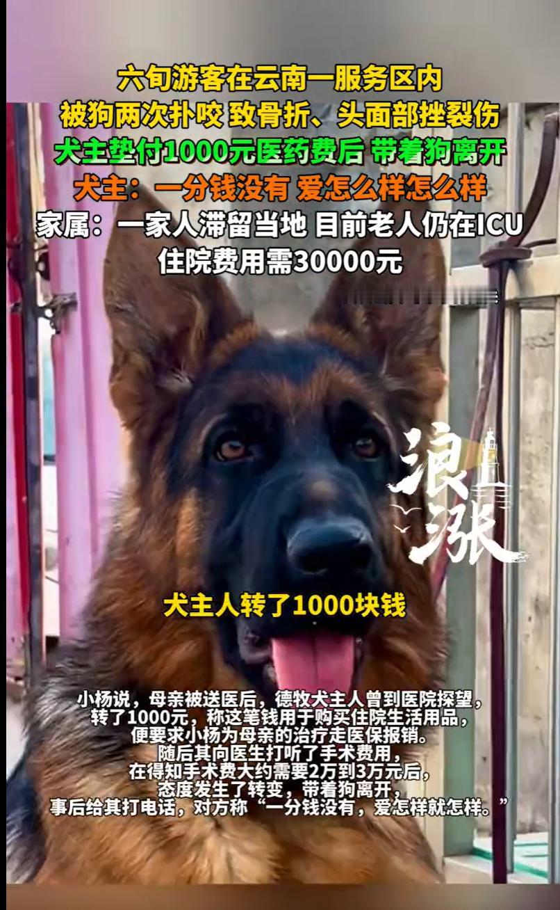 云南罗平,一女子带着一家六口从山东出发自驾游,本想着在服务区歇歇脚,结果一条没拴绳的德牧犬突然从没关门的车里冲出来,对着六旬老人就是两次扑咬。老人当场倒地,股骨颈骨折、头脸全是血,至今还在ICU躺着。狗主人一开始拍着胸脯说全权负责,转头就只转了1000块钱,然后丢下一句“不走医保一分没有”,直接玩起失联。好在警方已经立案,这事没那么简单。 2月21号,小杨一家自驾游,开车到了某服务区,因开了长途车,人困马乏,一家人就打算在服务区里歇歇脚,活动活动筋骨。 小杨和丈夫去检查车况,看看轮胎,加点玻璃水什么的。 小杨的父母就在服务区里散散步,呼吸一下新鲜空气。 服务区嘛,地方不大,停着不少大大小小的车辆。 老人散步的地方,离一个停车位也就五到十米远。 谁也没想到,危险就藏在一辆看似普通、车门都没关严实的车里。 突然,从那辆没关门的车里,猛地窜出一条大狗,是一条德国牧羊犬,体型不小,看着就挺唬人。 这狗冲出来的方向,直直地就冲着小杨的母亲去了。 老人根本来不及反应,被这条大狗猛地一扑,直接就撞倒在地。 狗主人当时也在场,看见狗闯了祸,赶紧跑过来把狗撵回了车上。 可不知道是疏忽了还是怎么着,他撵回狗之后,竟然没把车门关上。 结果,那狗又从车上冲了下来,这一次更严重,对着倒在地上的老人就开始撕咬。 老人的头面部、手臂都受了伤,场面一度非常混乱。 小杨听到呼喊声跑过去的时候,母亲已经躺在地上,脸上、身上都是血,痛苦地呻吟着。 她吓得腿都软了,但还强撑着第一时间拨打了120和110。 很快,服务区所属辖区的派出所的工作人员赶到了现场,询问了情况,固定了证据。 当时,那条德牧的主人态度倒是挺好的,拍着胸脯说这事儿是他的责任,他全权负责,并且安排他女儿跟着120救护车,一起把小杨的母亲送往医院。 到了医院,一番紧急检查和处置之后,情况比想象的要严重得多。 医院诊断,老人是右侧股骨颈骨折,就是大腿根部那个关键的部位骨折了,另外还有头面部挫裂伤和左侧上臂挫伤,这都是狗扑咬、拖拽造成的。 2月23号晚上,老人接受了手术,手术做了整整三个小时。 术后,因为伤势较重,加上年纪也大了,直接被送进了ICU重症监护室,继续观察治疗。 小杨说,刚开始的时候,那个狗主人还来医院探望过一次,也向医生打听手术大概要花多少钱。 医生告诉他,估计得两三万,就是从那一刻起,对方的态度开始变了。 后来,狗主人通过微信,给小杨转了一千块钱,备注说的是让买点住院用的生活用品。 可紧接着,狗主人要求治疗费用必须走医保报销。 小杨当时就愣了,她隐约觉得这事儿不对,就赶紧去问主治医生。 医生的回答很明确,这属于有明确第三方责任人的意外伤害,如果隐瞒事实走医保报销,那是骗保行为,是违法的,绝对不行。 小杨把医生的原话告诉了狗主人。 结果对方的态度立马就强硬起来了:“你们不走医保,那一分钱我都不会再拿了。” 之前的承诺,一千块钱的“人道主义”转账,就这么翻篇了。 没办法,小杨只能再次求助派出所。 在警方的介入下,双方坐在一起进行调解。 小杨要求狗主人必须赔付医保不能报销的那部分手术费,以及后续估计需要的大概两万块钱的治疗费用。 可狗主人就是不松口,就说要看账单,要等所有费用都出来了再说。 双方就这么僵住了,谁也说服不了谁。 最后,调解失败,狗主人直接开车离开了,电话也开始不接了。 目前,警方已经正式立案了。 《刑法》第二百三十五条规定,过失伤害他人致人重伤的,处三年以下有期徒刑或者拘役。 本案中,狗主人没关好车门,导致犬只伤人,属于“过失”行为。 如果老人的伤情经鉴定构成重伤,那么狗主人的行为就可能涉嫌“过失致人重伤罪”。 这需要警方立案侦查,并由法医进行伤情鉴定,“股骨颈骨折”在很多司法实践中,有被鉴定为重伤的可能性。 即使不构成刑事犯罪,狗主人的行为也涉嫌治安违法。 《治安管理处罚法》第八十九条规定,饲养动物,……未对动物采取安全措施,致使动物伤害他人的,处一千元以下罚款;情节较重的,处五日以上十日以下拘留。 具体到本案,狗主人没有规范管理饲养的德牧犬,导致伤害他人,依法面临最高10日拘留或1000元罚款。 此外,《民法典》第一千二百四十七条规定,禁止饲养的烈性犬等危险动物造成他人损害的,动物饲养人或者管理人应当承担侵权责任。 结合曲靖地区《关于公布烈性犬品种名录和大型犬标准的通告》等规定,德国牧羊犬属于当地禁养烈性犬。 本案中,德牧犬如查实属于烈性犬,则其两次扑咬老人的情况,符合担责条件,赔偿范围包括偿医疗费、护理费、交通费、康复费、住院伙食补助费等。 对此,您怎么看?