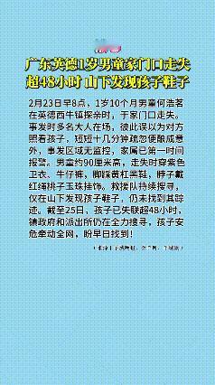 1岁男童在家中大门口还能走丢?有些难以置信!近日,广东1岁男童春节探亲走失了,除了找到一只鞋,尚无有效进展,媒体报道的细节也只有这几点。 第一,失联时间是在2月23日早上八点,这个时间按理说村门口村民应该很多,谁看到了这么小的孩子在外面走,身边又没有大人,都会去留意的,可惜并没有这样的线索。 第二,失联地点就在家门口,当时还站着多位大人,为何包括孩子母亲在内没有一人留心呢?据孩子母亲回忆:其他人都以为这么小的孩子,应该有其他人在照看,也就二十分钟的时间,孩子不见了,怎么找都找不着。 第三,搜救人员除了在山下找到了孩子的鞋子外,并没有其他线索和踪迹。这么小的孩子20分钟时间,他又能跑多远呢?因为事发地靠近山,但就算孩子走失了进山,也跑不了多远,种种迹象表明,大概率孩子是被带走了,又或是遗落到了附近的坑洞河流里。 第四,事发地无监控。 这条新闻看得太让人揪心了,一个不到两岁的孩子,在春节探亲时走失,而且是在大人的眼皮子底下走丢的,唯一的线索只是在山下找到了一只小鞋子…… 家门口那么多人,谁都以为有人管,结果谁都没管,听起来太荒唐了。 而十几分钟的时间,一个孩子可能会迷失方向,可能会走出去很远,又或者走到了危险地带。 在山下找到了鞋子,意味着孩子很可能去过水边、陡坡、草丛、深沟……而这些任何一个地方,对幼童来说都是致命的。 孩子妈妈说:事发区域没有监控。这意味着:孩子怎么走的?跟谁走的?往哪个方向去了?这些全无线索! 只能靠人力一点点搜,而搜救黄金时间那么短,一旦走丢的时间拉长,搜救的难度会成倍增加。 最后,但愿该子能够平安归来吧!