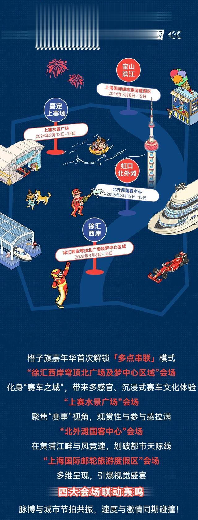 本届格子旗嘉年华将以“申城竞速·为新赴约SHANGHAILET'SMEET!”为主题,联动徐汇西岸穹顶北广场及梦中心、上赛水景广场、北外滩国客中心、上海国际邮轮旅游度假区等四大核心地标,通过多维呈现,将赛车文化的激情与魅力深度融入城市肌理,为全球车迷与市民游客献上一场融合赛事、文化、旅游、商业与生活方式的沉浸式全民狂欢。