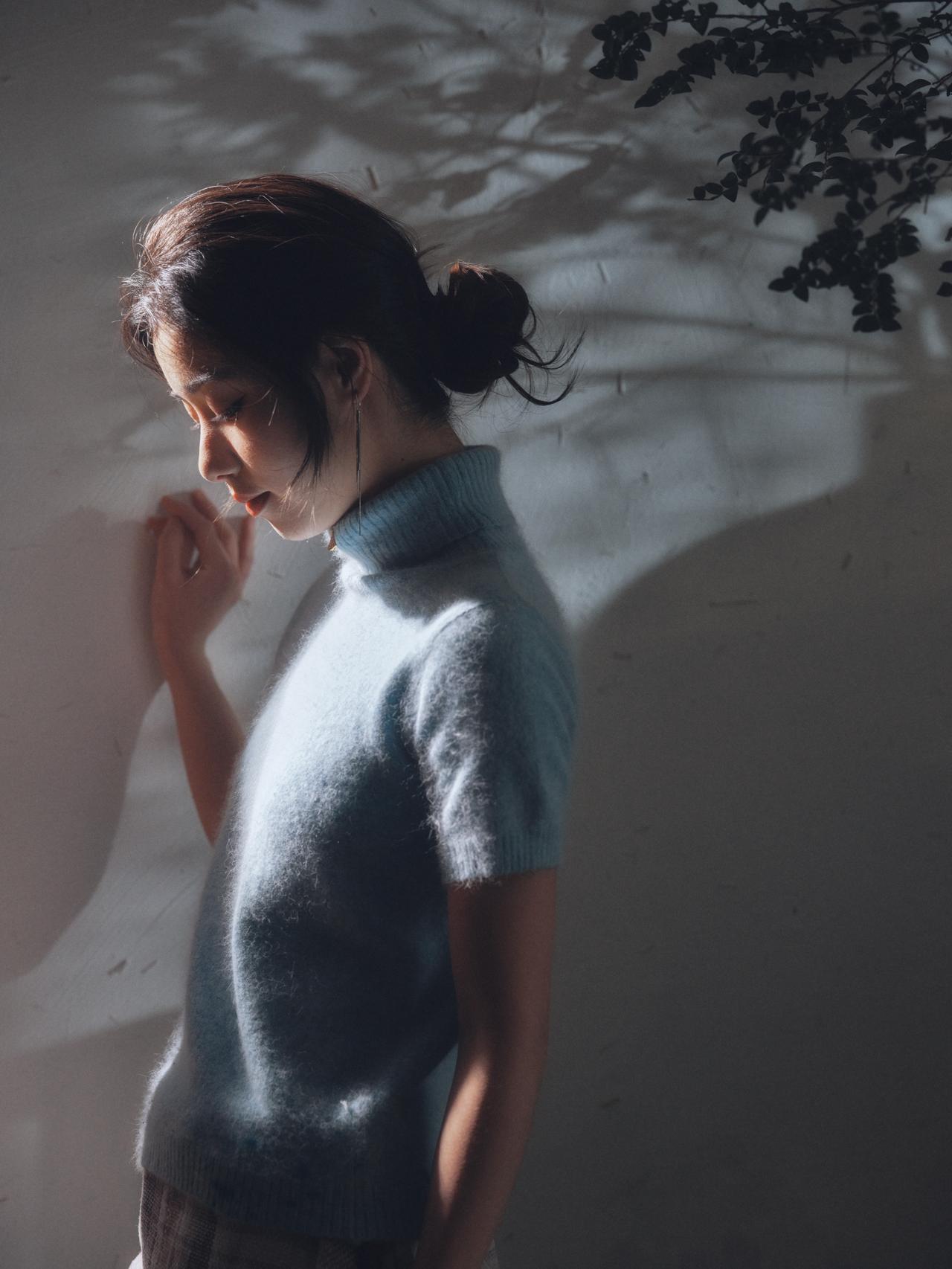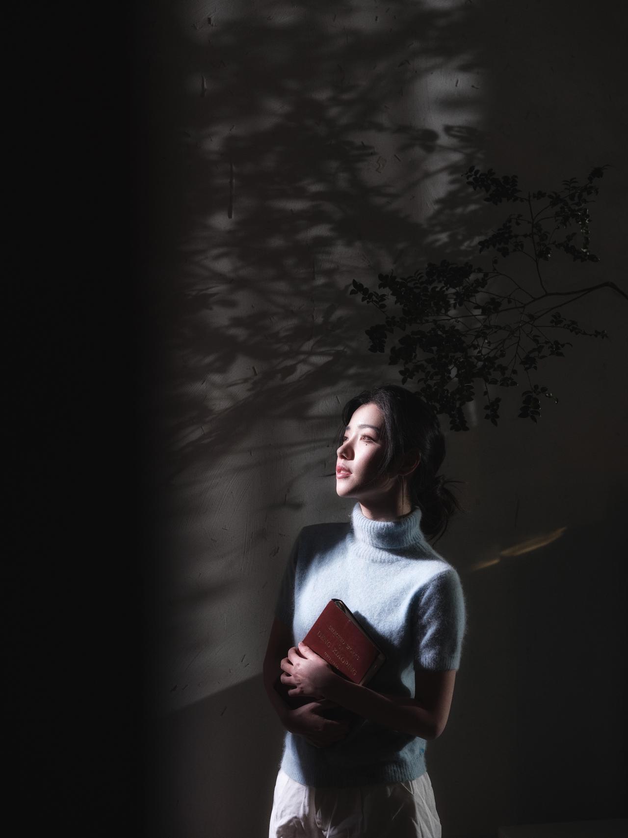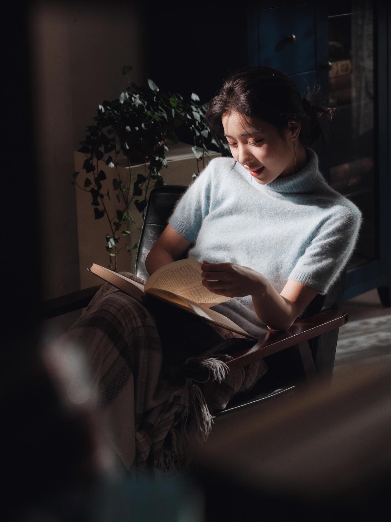 剥橘皮的特写镜头,是整组作品中最具生活温度的一笔,也成为了情绪表达的关键落点。人物低头专注的神情,与手指间橙黄的橘皮形成强烈的色彩对比,暖调的橘皮在冷调的光影氛围中,成为了情绪的温暖支点,让原本疏离的画面多了几分烟火气。 画面的光影处理依旧延续了侧逆光的风格,光线透过橘皮的纹理,在手部形成斑驳的光影,细腻地捕捉到了皮肤的质感与织物的肌理。前景摊开的书籍作为道具,与剥橘皮的动作形成动静结合,暗示了人物在阅读间隙的片刻松弛。构图上,摄影师采用近景特写,将视觉焦点牢牢锁定在人物的手部动作与面部神情上,背景的绿植与深色家具被虚化处理,进一步强化了细节的情绪张力。这一镜头的妙处在于,用最日常的动作,消解了情绪人像的刻意感,让孤独的情绪中,藏着生活的细碎温柔。