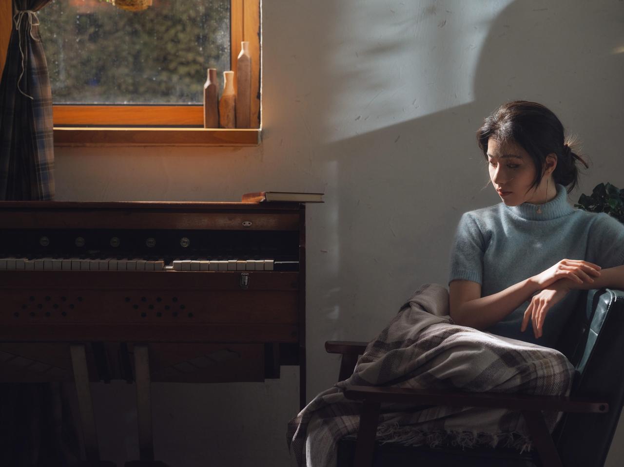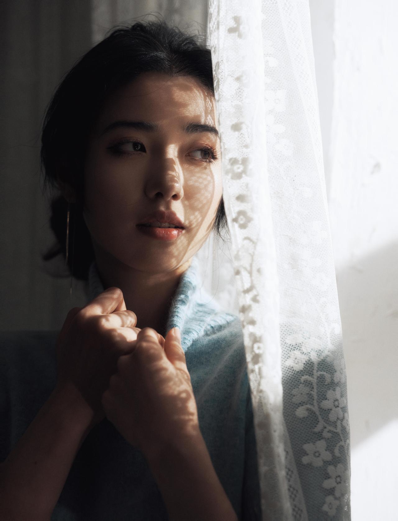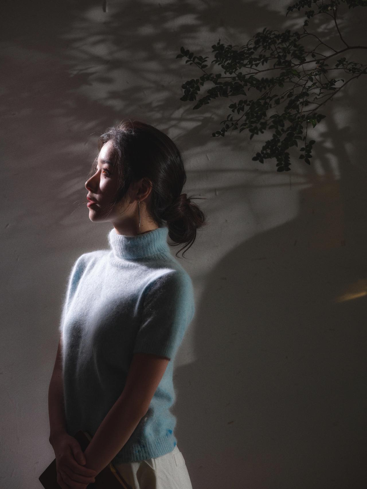 剥橘皮的特写镜头,是整组作品中最具生活温度的一笔,也成为了情绪表达的关键落点。人物低头专注的神情,与手指间橙黄的橘皮形成强烈的色彩对比,暖调的橘皮在冷调的光影氛围中,成为了情绪的温暖支点,让原本疏离的画面多了几分烟火气。 画面的光影处理依旧延续了侧逆光的风格,光线透过橘皮的纹理,在手部形成斑驳的光影,细腻地捕捉到了皮肤的质感与织物的肌理。前景摊开的书籍作为道具,与剥橘皮的动作形成动静结合,暗示了人物在阅读间隙的片刻松弛。构图上,摄影师采用近景特写,将视觉焦点牢牢锁定在人物的手部动作与面部神情上,背景的绿植与深色家具被虚化处理,进一步强化了细节的情绪张力。这一镜头的妙处在于,用最日常的动作,消解了情绪人像的刻意感,让孤独的情绪中,藏着生活的细碎温柔。