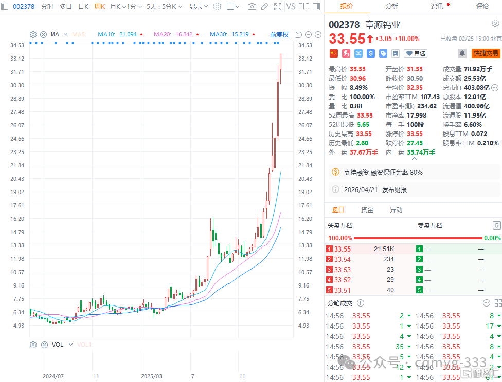 比如章源钨业作为资源型龙头企业,率先公布2026年2月下半月长单采购价格,黑钨精矿、白钨精矿价格涨幅近9%,仲钨酸铵涨幅超10%。该公司的业绩增长预期明确,因而被资金疯狂拥抱,股价今年内涨幅超136%(自从2025年低点至今涨幅高达3.4倍),成为板块核心标的之一。