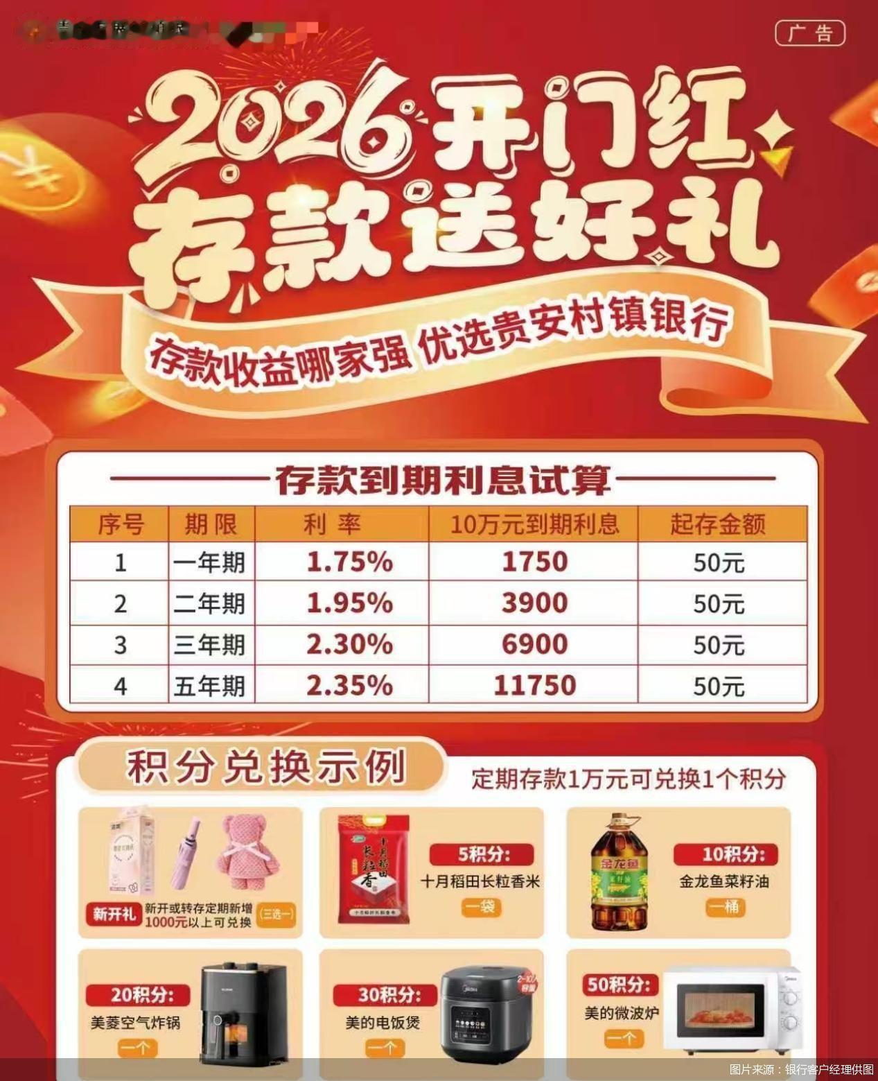为核实相关情况,北京商报记者以储户身份进行了咨询,贵安新区发展村镇银行一位客户经理发来该行2026年“开门红”存款送好礼活动详情。从利率表现来看,该行定期存款利率起存金额为50元,一年期、二年期、三年期、五年期存款利率分别为1.75%、1.95%、2.3%、2.35%,以存入10万元存款为例,到期利息分别为1750元、3900元、6900元、11750元。除了利息收益,活动还设置了积分兑换福利,定期存款1万元可兑换1个积分,5积分可兑换大米一袋,10积分可兑换菜籽油一桶。