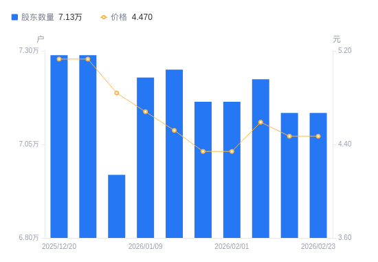 2月25日消息,数据显示,截至2026年2月23日,凤凰航运A股股东总户数为7.13万户,较上期(2026年2月20日)不变。公司最新A股总股本为10.12亿股,其中流通A股10.12亿股,户均持有流通A股数量为1.42万股,较上期不变;户均持流通A股市值6.34万元,较上期不变。