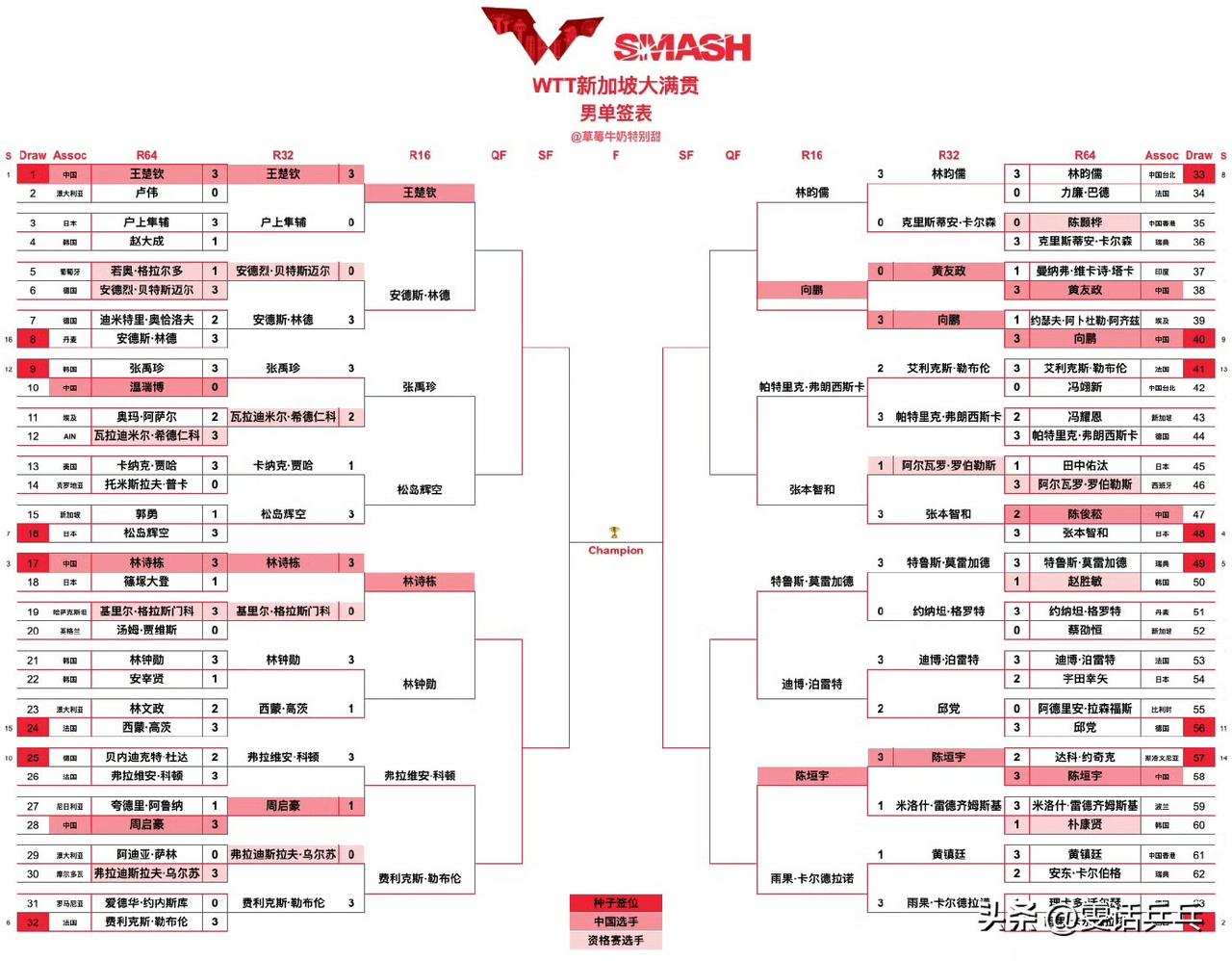 男单16强全部产生,1/8决赛名单公布! WTT新加坡大满贯2026 男单1/8决赛:2.26 1.王楚钦🇨🇳VS安德斯·林德🇩🇰 2.张禹珍🇰🇷VS松岛辉空🇯🇵 3.林诗栋🇨🇳VS林钟勋🇰🇷 4.弗拉维安·科顿🇫🇷VS费利克斯·勒布伦🇫🇷 5.林昀儒(中国台北)VS向鹏🇨🇳 6.帕特里克·弗朗西斯卡🇩🇪VS张本智和🇯🇵 7.特鲁斯·莫雷加德🇸🇪VS迪博·泊雷特🇫🇷 8.陈垣宇🇨🇳VS雨果·卡尔德拉诺🇧🇷