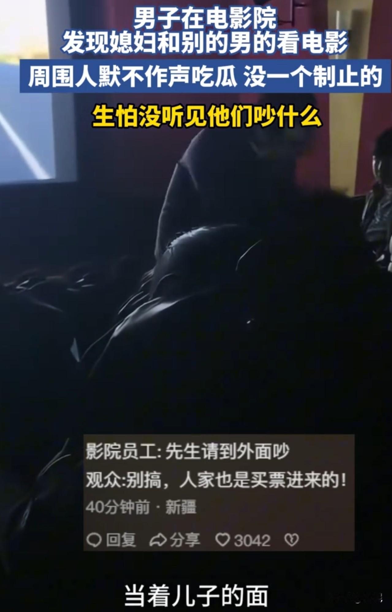 这场电影票值了,买得是爱情片,结果变成了爱情伦理武侠片,买一送一啊。 一男子在电影院发现媳妇和别的男的看电影,男子直接跟男的拉扯起来,媳妇抱着男子生怕打起来。 没想到,周围人默不作声吃瓜,没一个出声制止的,生怕没听见他们吵什么。个个都是吃瓜群众,凑热闹的群众。 不得不说,这瓜的确比电影好看,毕竟电影可以重播,这大瓜错过就没了。 “你敢做就不要怕,你是男人他*的就不要怕,你是不是男人。当着我的面,当着儿子的面,跑什么抓,你敢做……” 这是媳妇带着儿子就正大光明私会小三,丈夫发现直接殴打小三,媳妇还拦着。 事情就这么凑巧了,媳妇私会小三,丈夫也去电影院?怕是早出现异常了,有预谋跟踪。 这世道太乱了,不是男的出轨就是女的出轨,以至于大家的接受能力逐渐增强。更多的是理性看待吃瓜事件,只看不制止。