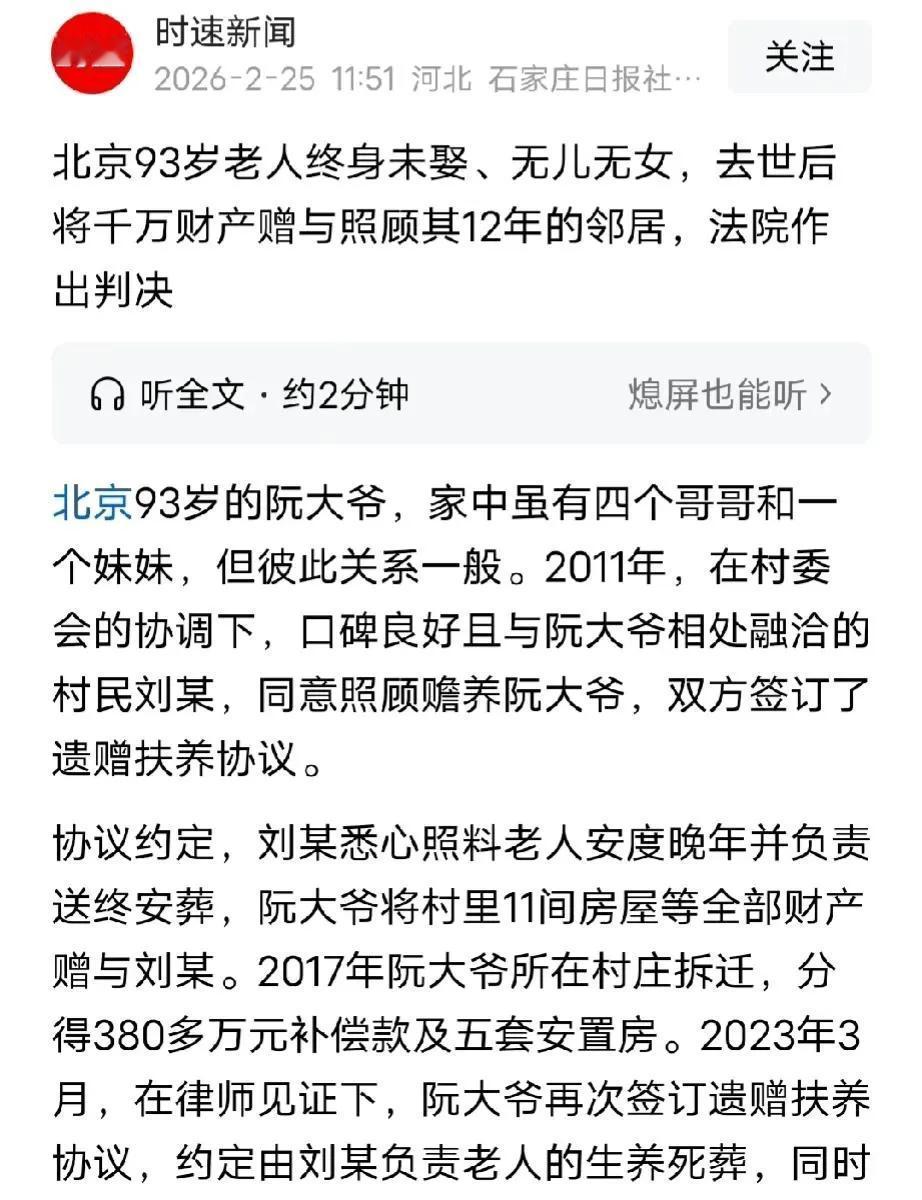 远亲不如近邻!北京,81岁大爷终身未娶,无儿无女,与4个哥哥、1个妹妹关系不合,为了晚年有依靠跟邻居签订协议:邻居负责给他养老送终,大爷将名下千万财产送给邻居。协议签订后,邻居任劳任怨悉心照料大爷12年,直到他去世,并给他妥善办理后事。没想到,大爷的部分亲属却未参与协议签订,邻居担心协议无效起诉到法院,法院判决亮了。 阮大爷一生未娶,无儿无女,父母也早已过世,他有4个哥哥、1个妹妹。 不过,阮大爷平时跟兄妹的关系不冷不热,逢年过节都没一声问候,这么多年阮大爷一直都是一个人生活。 2011年,81岁的阮大爷,意识到自己年纪越来越大,身边没个依靠的,他越发感觉孤苦无依的无奈。 平时阮大爷跟他的邻居刘某关系不错,有时他有个头疼脑热的刘某也会关照他。 阮大爷为了让自己的晚年有个保障,就跟邻居商量让他来照顾自己的晚年,给他养老送终,条件是他把自己的11间屋子留给刘某。 刘某是一个很有同情心的人,在村里口碑不错,他看阮大爷孤苦无依,哪怕大爷没给他任何好处他能搭把手都会搭把手。 所以,当阮大爷跟他提出这个条件的时候,他很爽快地答应了,之后两人签订了遗赠抚养协议。 从那时起,刘某尽心尽力,无微不至地照顾着阮大爷,对待他像对待自己的亲爹娘。 转眼到了2017年,阮大爷所在的村子拆迁,他获得380万补偿和5套安置房。 随着年龄渐渐老去,阮大爷行动越来越不方便,照顾他要更加地细心和耐心。 阮大爷感激刘某对他的照顾,2023年3月份又跟刘某再次签订遗赠抚养协议。 两人约定由刘某负责阮大爷的生养死葬,而刘大爷名下的房产和所有财产归刘某所有,签下协议后刘某继续照顾着阮大爷。 没想到9月份,阮大爷突然病重,最终撒手人寰。 刘大爷去世后,刘某认为自己照顾他12年,理应接受他的遗赠,但阮大爷的部分亲属没有参与参与协议签订。 刘某起诉到法院,想让法院确认这份协议有效。 法院经过调查,并找村委会核实,证明刘某确实十几年来一直好好照顾阮大爷,协议也是老人真心愿意签的。 最终法院判决这五套房子,全都归刘某继承。 《民法典》第1158条规定,自然人可以与继承人以外的组织或者个人签订遗赠扶养协议。按照协议,该组织或者个人承担该自然人生养死葬的义务,享有受遗赠的权利。 本案中阮大爷无儿无女,与兄妹关系疏远,他自愿和邻居刘某签订遗赠扶养协议,约定由刘某负责养老送终,自己的财产归刘某,完全符合这条规定。 刘某不是法定继承人,符合签约主体要求,协议内容是两人真实意愿,不违反法律规定,法院调查确认刘某连续12年悉心照料老人、妥善办理后事,已经完整履行生养死葬的全部义务。 因此刘某依法享有受遗赠的权利,亲属是否签字不影响协议的合法效力。 《民法典》第1123条规定,继承开始后,按照法定继承办理;有遗嘱的,按照遗嘱继承或者遗赠办理;有遗赠扶养协议的,按照协议办理。 这条明确遗赠扶养协议效力优先于法定继承,本案中阮大爷的兄妹属于法定继承人,但老人生前签订了合法有效的遗赠扶养协议,刘某已经依约履行全部义务。 所以应当优先按照协议执行,而不是按法定继承由兄妹继承。 法院走访村委会与邻居,证实协议真实、刘某长期尽孝,不存在欺诈、胁迫等无效情形,据此认定协议合法有效,判决五套房产全部权益由刘某继承,既尊重老人真实意愿,也保护了尽心赡养者的合法权益,符合法律规定与公平原则。 对此,大家怎么看?